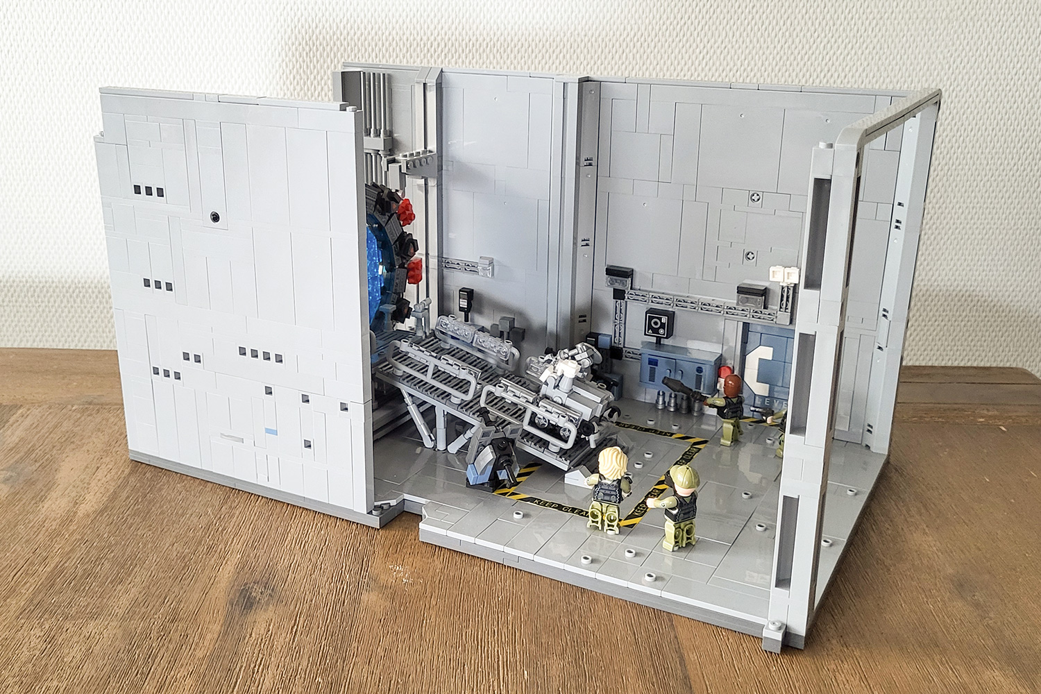 Insgesamt ist das Tor jedoch, im Zusammenspiel mit den Figuren und den Geräten, im Maßstab nicht ganz stimmig und müsste etwas größer sein. Bei der Erstellung lag der Fokus dem Anschein nach auf dem Kompromiss zwischen gleichmäßiger Gestaltung des Rings und Vitrinen-freundlicher Größe. Auch hier sollte sich im Vorfeld bewusst gemacht werden, dass es trotz der abnehmbaren Wände eine Herausforderung ist, den Torraum adäquat auszustellen – und zu transportieren. Denn stabil lässt es sich nur an den hinteren Seitenwänden heben.