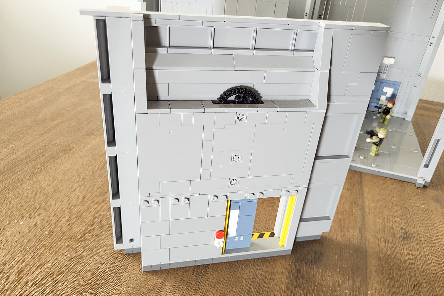 Um das Tor, welches als Schiebetür funktioniert, später funktionsfähig umzusetzen, muss im Anschluss der entsprechende Platz umbaut werden. Hier kommt eine um 90° gedrehte Bauweise zum Einsatz, um die umschließende Wand relativ dünn aus Plates und Fliesen bauen zu können. Nach Einsatz des Tores wird oben ein Ringanker aus mehreren Bricks gebaut, um das Ganze zu stabilisieren. Im weiteren Verlauf wird die Mauer weiter hochgezogen und oben das Zahnrad für den Schiebemechanismus eingesetzt. Danach werden aus „Eck-Panel“, den sogenannten Corner Walls, links und rechts die Stützen des vorderen Rahmens gebaut, welche oben lediglich aus einem dünnen Steg aus Plates und Fliesen bestehen.