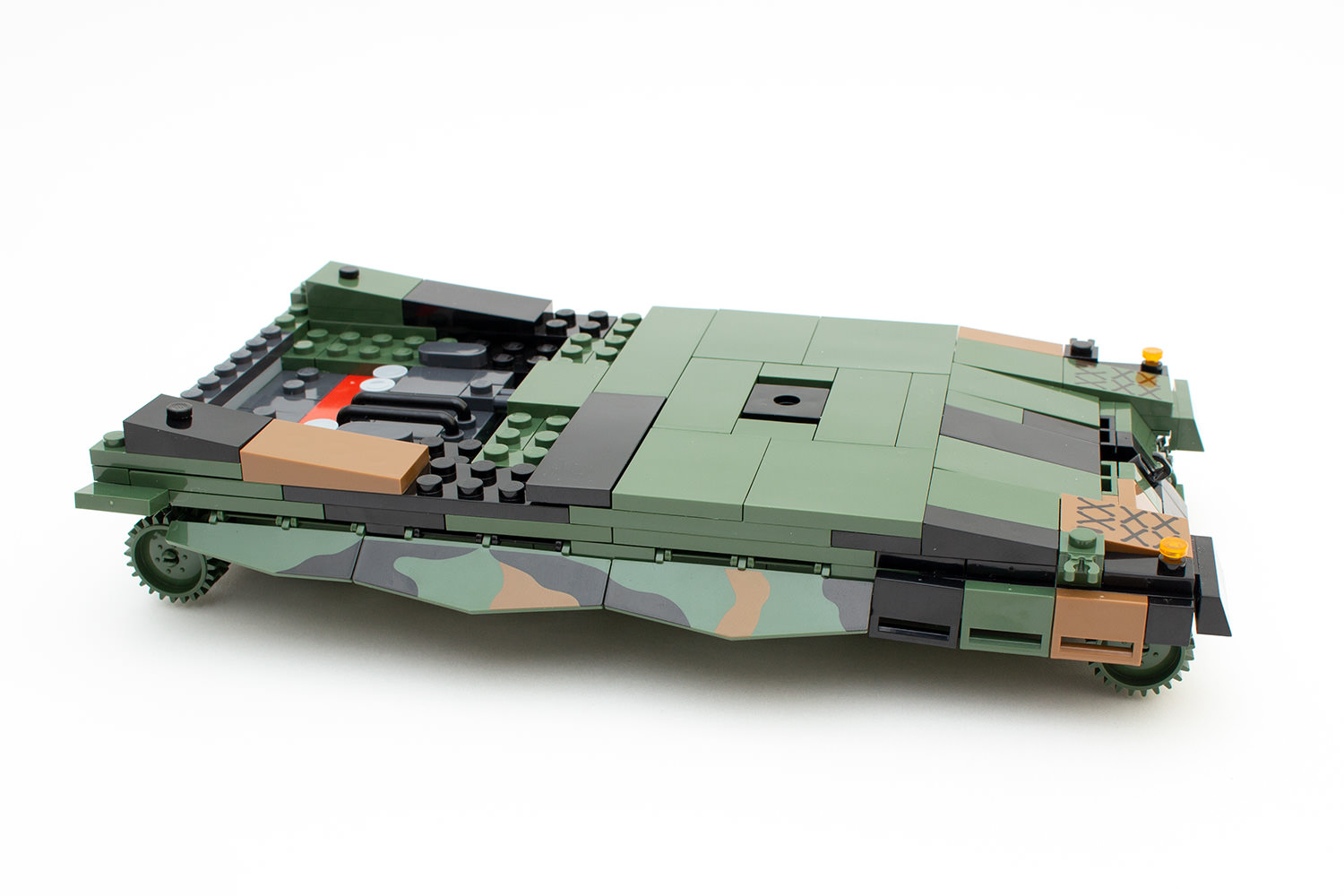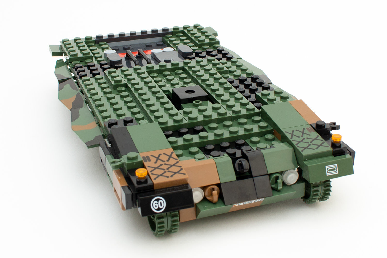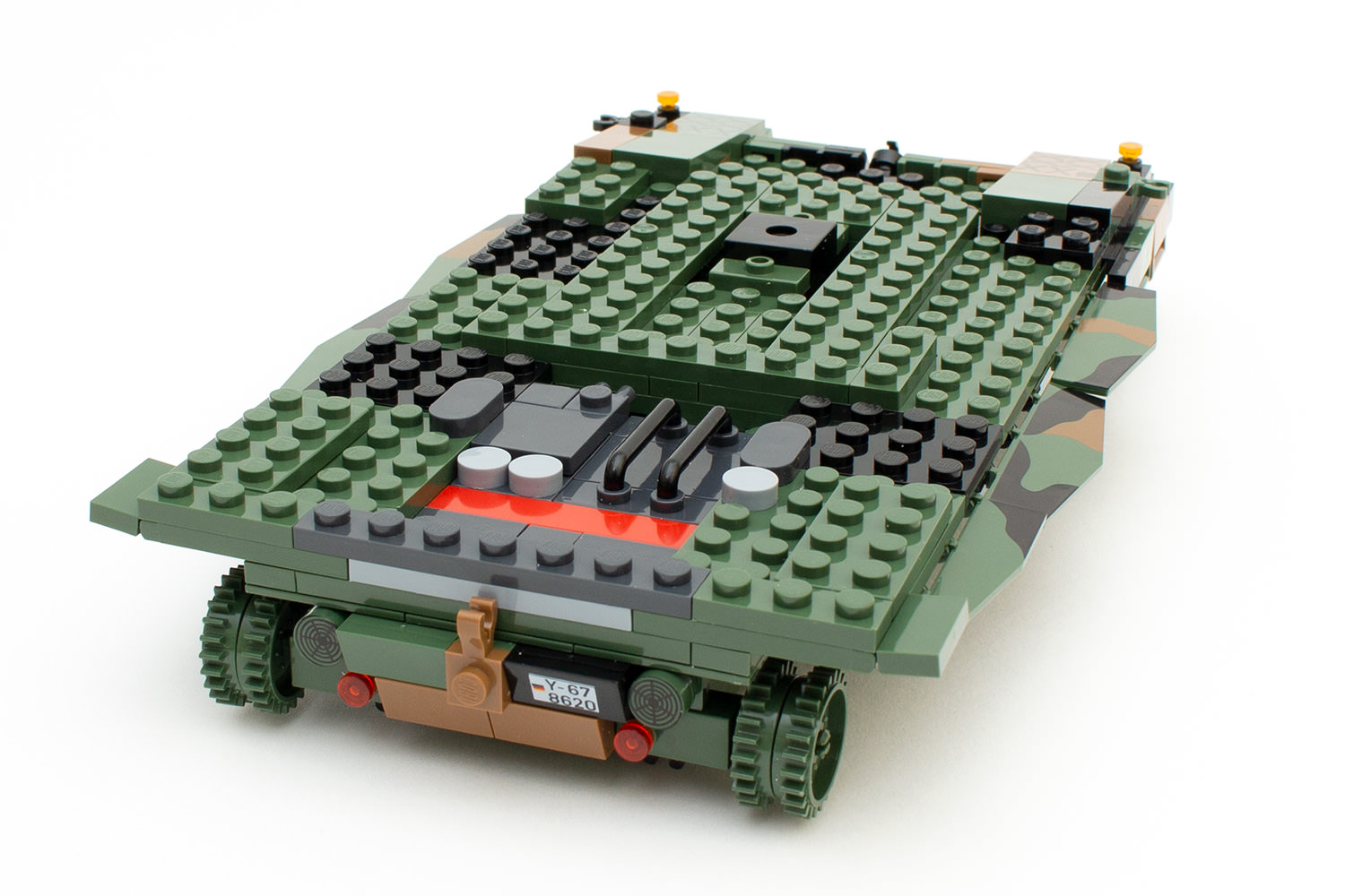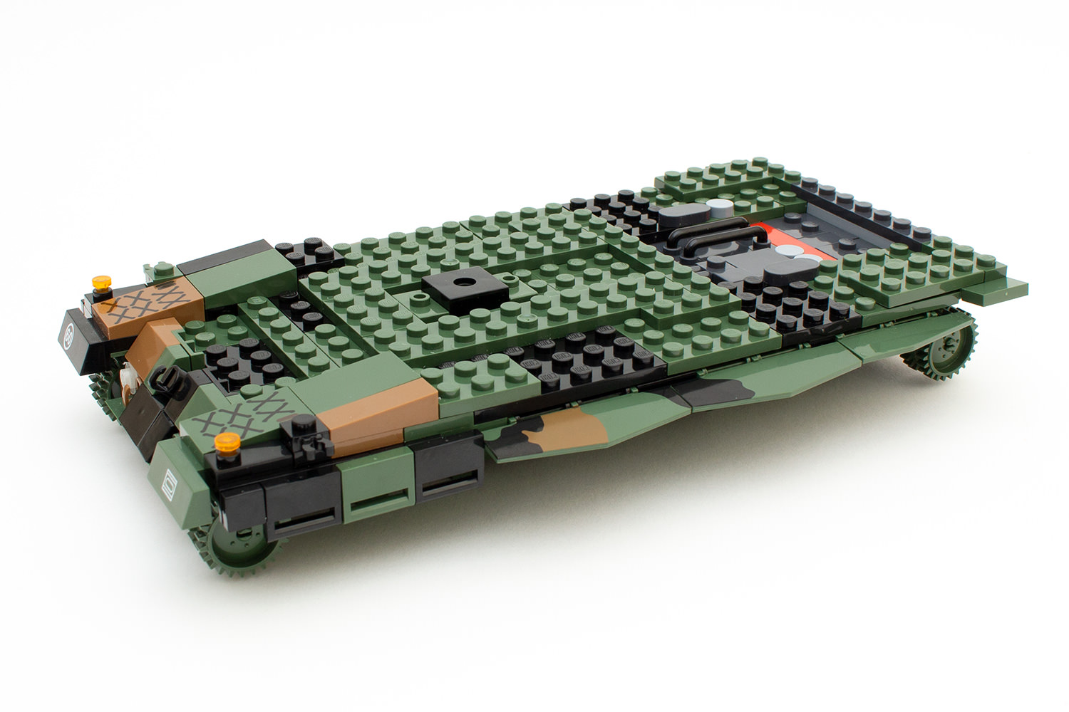 Die erste kniffelige Stelle tritt bei der Abdeckung des Motorraums auf. Hier ist darauf zu achten, dass die mittlere 3×4 große Fliese am Ende etwas heruntergedrückt wird, da diese beim Hochklappen sonst klemmt. Der darunter liegende Motor wird lediglich durch zwei Lüfter und einige andere Bauteile angedeutet, was aber auch darauf zurückzuführen sein dürfte, dass dieser beim fertigen Modell nur bei seitlich gedrehtem Turm sichtbar gemacht werden kann. Dennoch wäre eine detailreichere Gestaltung wünschenswert gewesen, auch wenn dadurch der Preis von rund 40 Euro sicherlich nicht gehalten werden könnte.