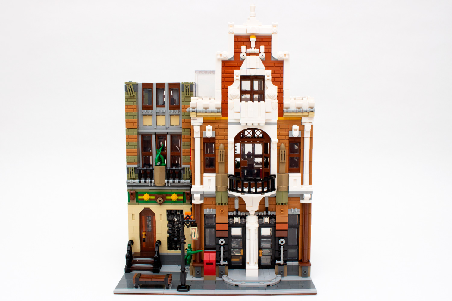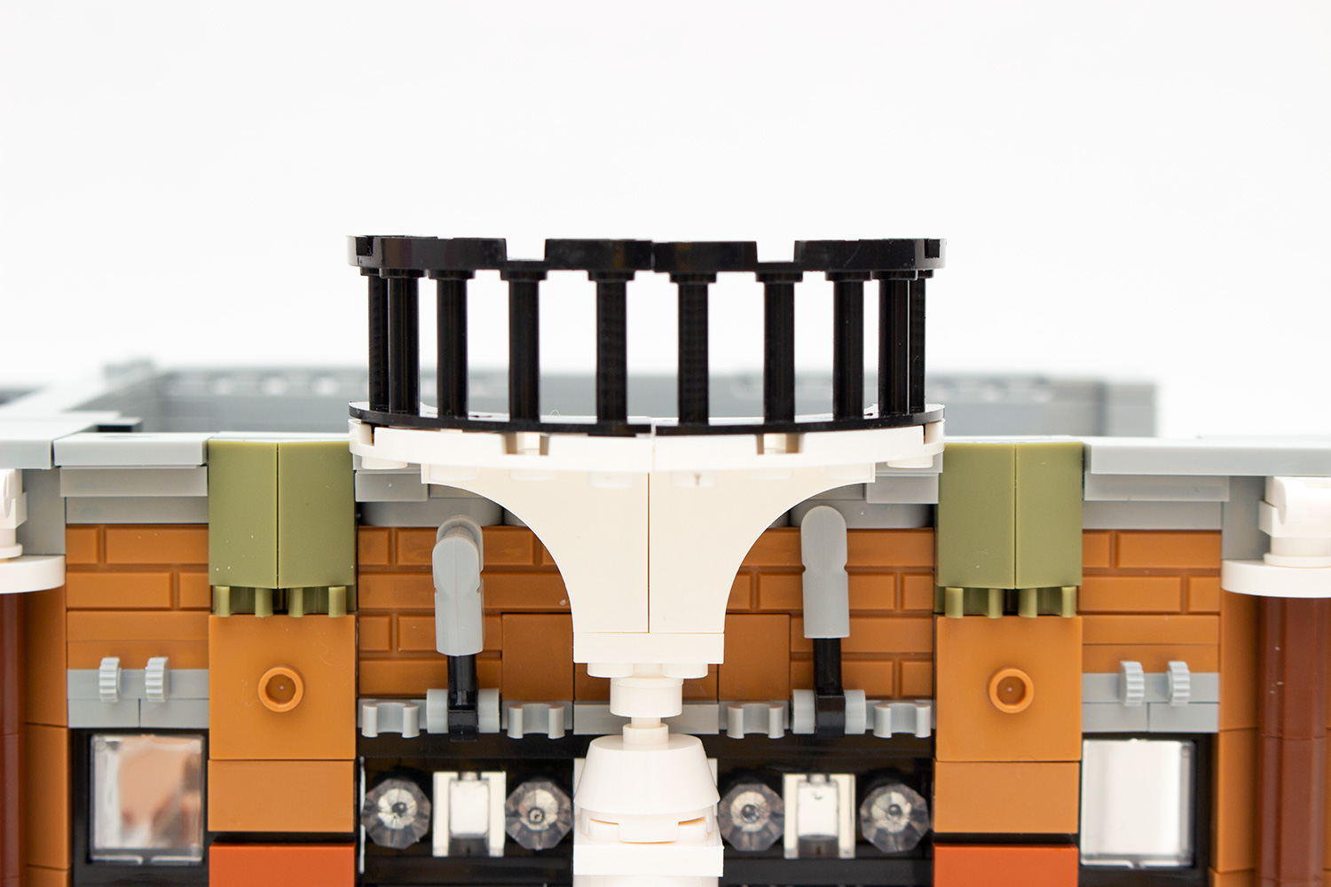 Darüber offenbart die vordere Fassade des Treppenhauses ein paar bauliche Mängel. Dieses wird aus einer Mischung aus SNOT- und konventioneller Bauweise und aus drei Segmenten errichtet. Massiv werden dabei nur die beiden äußeren Bereiche gebaut, die dann mittels drei Pin-Konnektoren auf den jeweiligen Noppen verbunden werden. In der Mitte werden dann übereinander gebaute Fenster eingeschoben. Dabei werden mehrere Probleme offenbar: So wird das vertikal eingesetzte Segment nur unten wirklich zwischen den Mauern eingeklemmt, oben ist zur Seite ein deutlicher Spalt vorhanden. Dadurch läuft das Konstrukt nach oben hin leicht aber sichtbar auseinander – auch die ebenso vertikal eingesetzten 2 × 8 Plate Modified mit Türschiene können den erkennbaren Spalt nicht komplett verdecken. Somit wirkt der Aufbau etwas verzogen.
