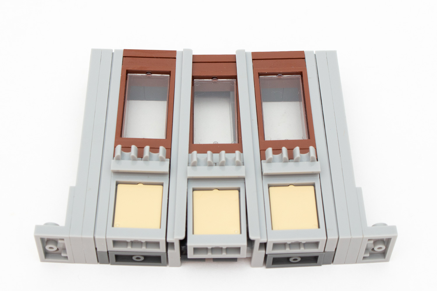 Noch deutlicher kommt das Problem in der Etage darüber zum Tragen. Auch wenn sich dieses unter anderem durch die kleineren Fenster in der unteren Reihe und jeweils zwei 1 × 1 Plate Modified mit Clips in jeder Fensterreihe von dem vorher beschriebenen Segment in Sachen Aufbau unterscheidet, ist das Konstrukt in weiten Teilen identisch zum vorherigen. In der Mitte sollen unter den Clips nun zusätzlich 1 × 2 Noppen große Plate Modified mit Türschiene eingesetzt werden – was in der Mitte wegen den erneut verwendeten großen Platten mit Türschiene nicht möglich ist, da die Steine sich im Grunde hinter der vertikalen Schiene befinden müssen. Hier muss auf eine normale 1 × 2 Plate aus eigenem Bestand zurückgegriffen werden, damit das Segment so passend gebaut werden kann.