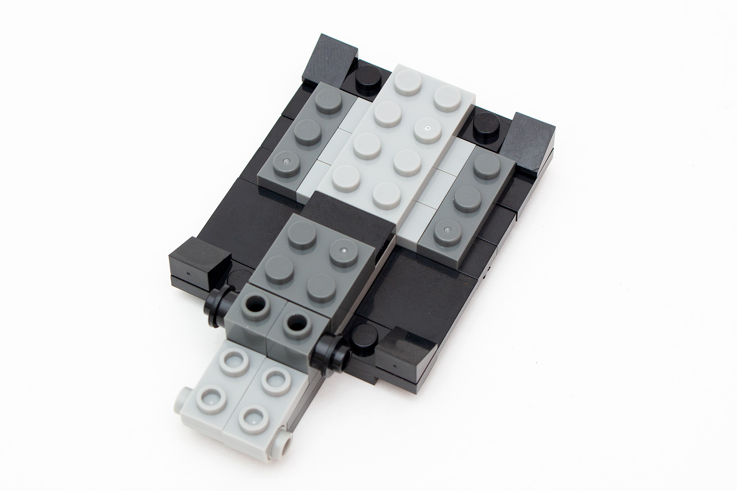 Danach geht es an die Fertigung der Tür für das Treppenhaus sowie die Eingangstür für die Angestellten des Postamtes, wobei bei ersterer über die SNOT-Bauweise (Studs Not On Top) von links nach rechts gebaut wird, bei letzterer auf eine Kombination aus traditioneller und der genannten Bautechnik zurückgegriffen wird. Durch die erneute Verwendung von 1 × 1 Brick Modified mit Noppen an der Seite kann diese Türumsetzung zusätzlich über die an diese grenzende Wand stabilisiert werden, wogegen die Eingangstür des linken Gebäudes einfach nur in einen Spalt zwischen den Fliesen gesteckt und im Grunde nur durch die linken und rechten Mauerteile sowie einer darüber gelegten 1 × 8 Noppen lange Plate gehalten und fixiert wird.