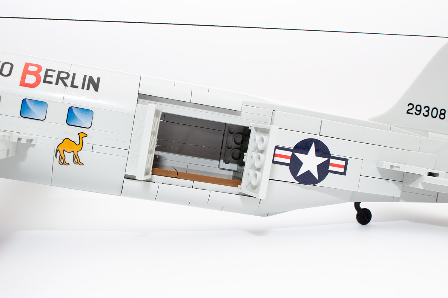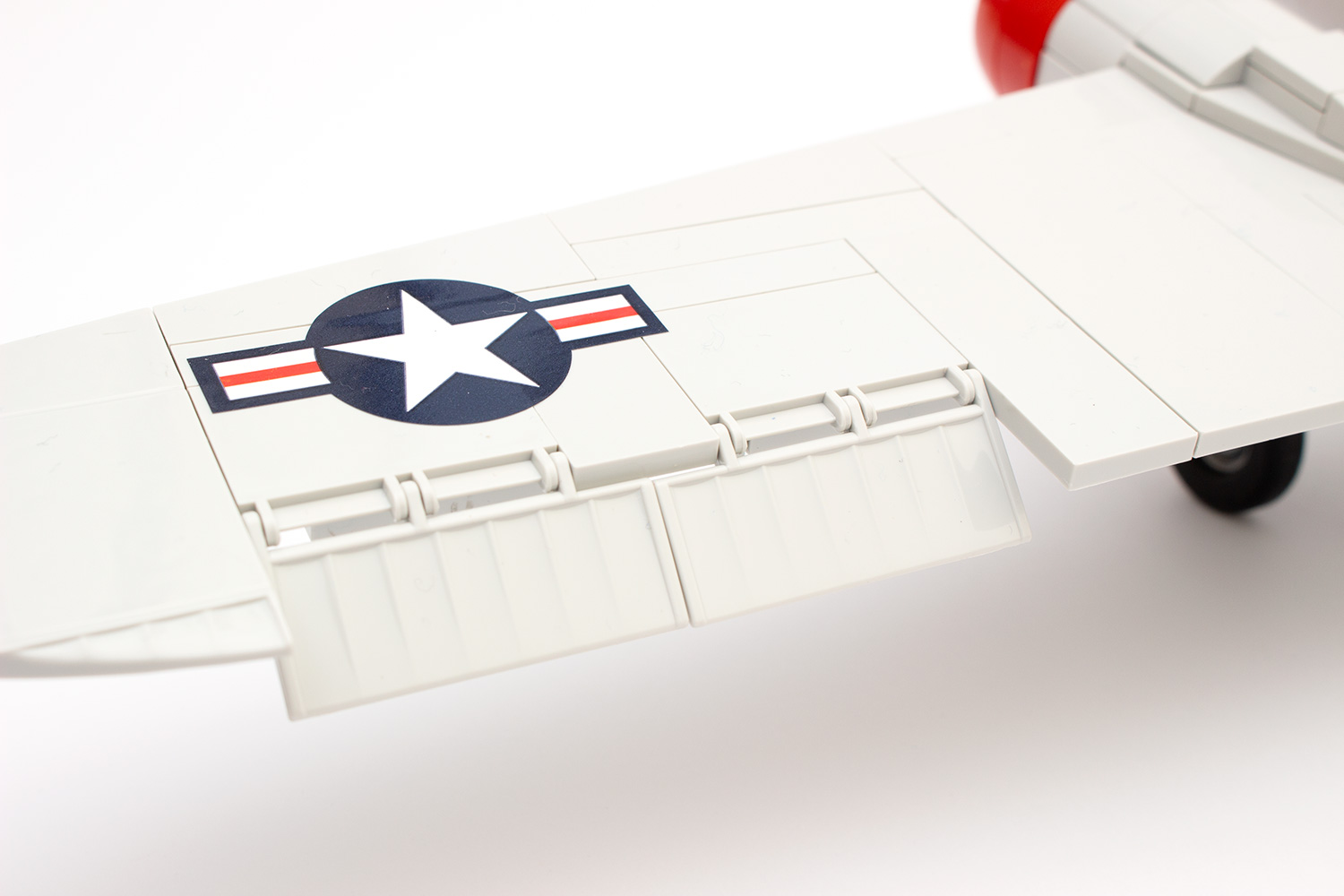 Auch wenn Aufkleber in den meisten Fällen negativ gesehen werden und bei einem hochwertigen Modell Prints im Grunde vorausgesetzt werden, muss bei der C-47 darüber hinweggesehen werden, denn viele Bereiche hätten nur mit Einschnitten anders gelöst werden können. Dort, wo es möglich war, setzt Cobi auch bei dem hiesigen Modell auf Prints, doch an vielen Stellen hätten sich diese über mehrere Bauteile erstreckt – was an diesen Stellen schlicht unmöglich umzusetzen gewesen wäre. Der einzige Ausweg wäre gewesen, diese Bereiche als Formteile herzustellen – womit der Klemmbausteinaspekt völlig verloren gegangen wäre. Der Vorteil ist zudem, dass die Aufkleber nicht aufgebracht werden müssen und die Steine später so völlig neutral weiterverwendet werden können.