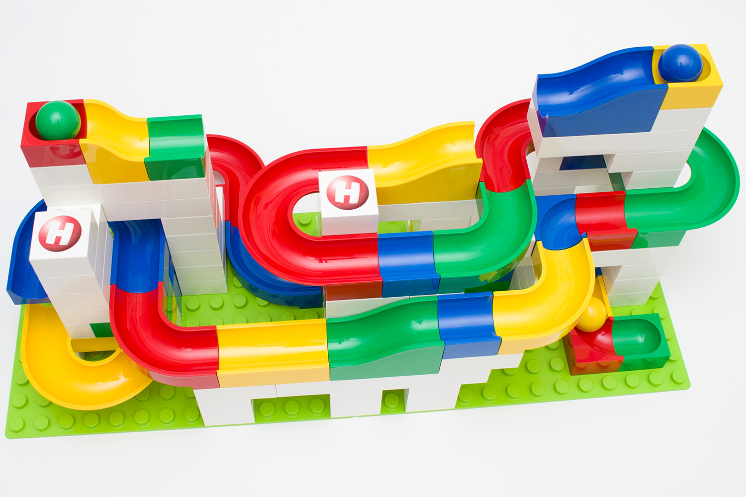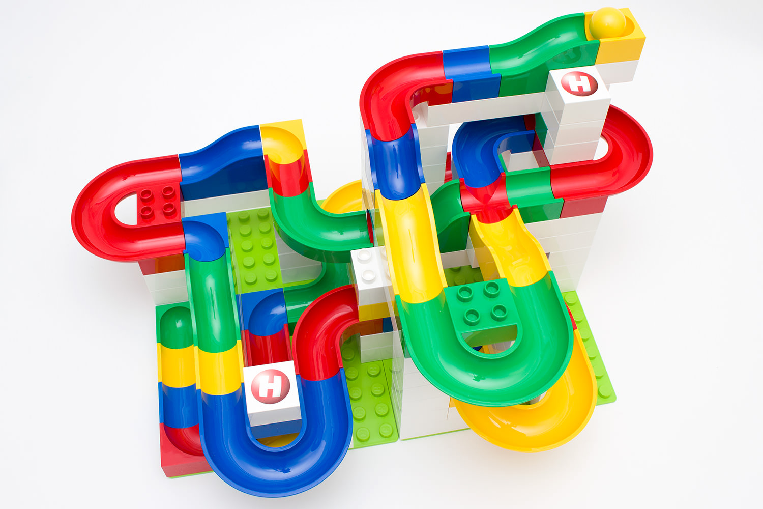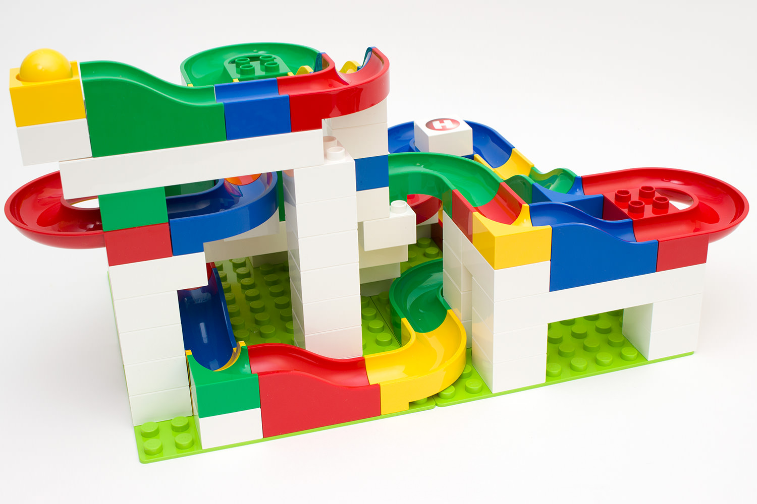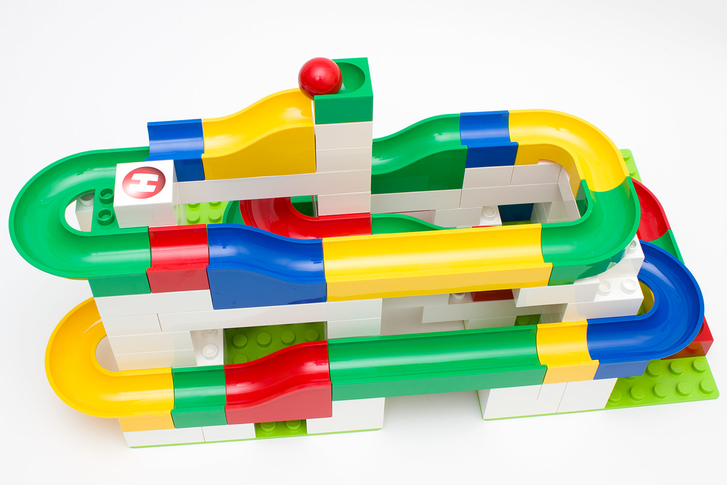 Während klassische Murmelbahnen oftmals nach kurzer Zeit langweilig werden, kann die Kugelbahn von Hubelino immer wieder neu entdeckt und auch in neue oder bestehende Szenarien eingebunden werden: Was spricht dagegen, die Bahn in ein Duplo-Dorf zu verbauen, bei dem ein großer Felsbrocken das Tal hinunterrollt?