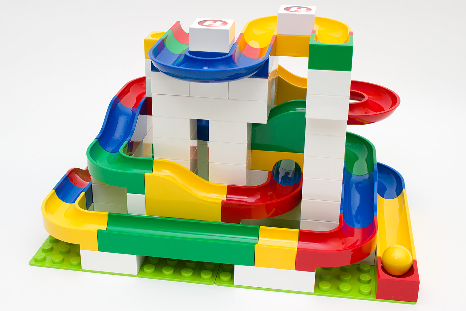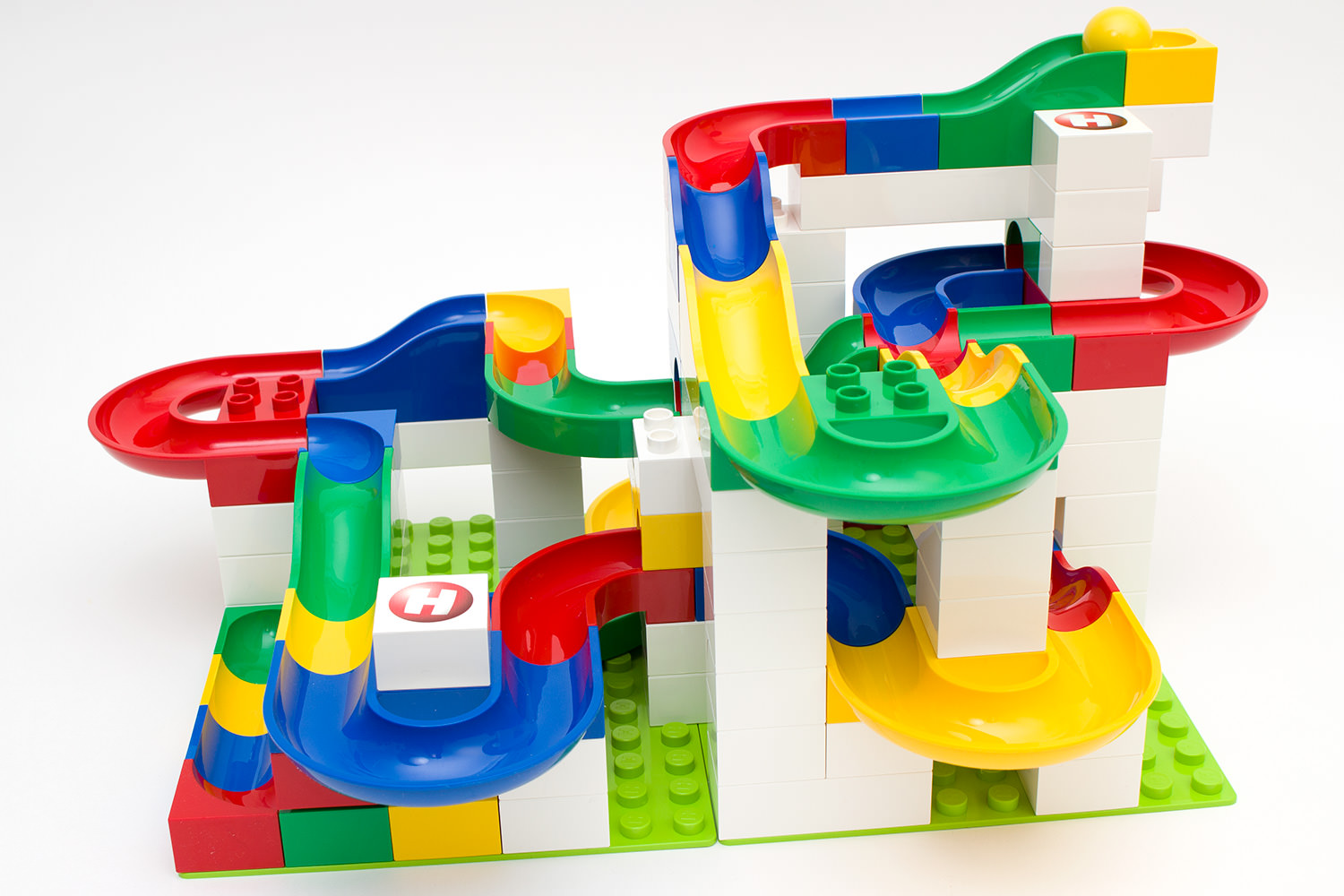 Kugelbahnen schmücken seit je her die Kinderzimmer unserer Zeit, ein jeder dürfte in seiner Kindheit Varianten aus Holz besessen oder eigene Bahnen aus diversen Alltagsgegenständen selbst gebaut haben. Aber nicht der dänische Marktführer Lego ist mit seiner Duplo-Serie auf die Idee gekommen, das System mit den großen Bausteinen für solche Konstruktionen zu nutzen, sondern ein kleines mittelständiges Unternehmen aus Nordrhein-Westfalen. Die einzelnen Duplo-kompatiblen Komponenten werden darüber hinaus allesamt ebenso in Deutschland gefertigt. Neben unter anderem Cobi und Q-Bricks zeigt nun auch Hubelino, dass für qualitativ hochwertige Klemmbausteine nicht nach China gegangen werden muss.