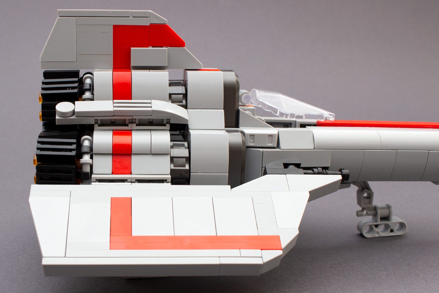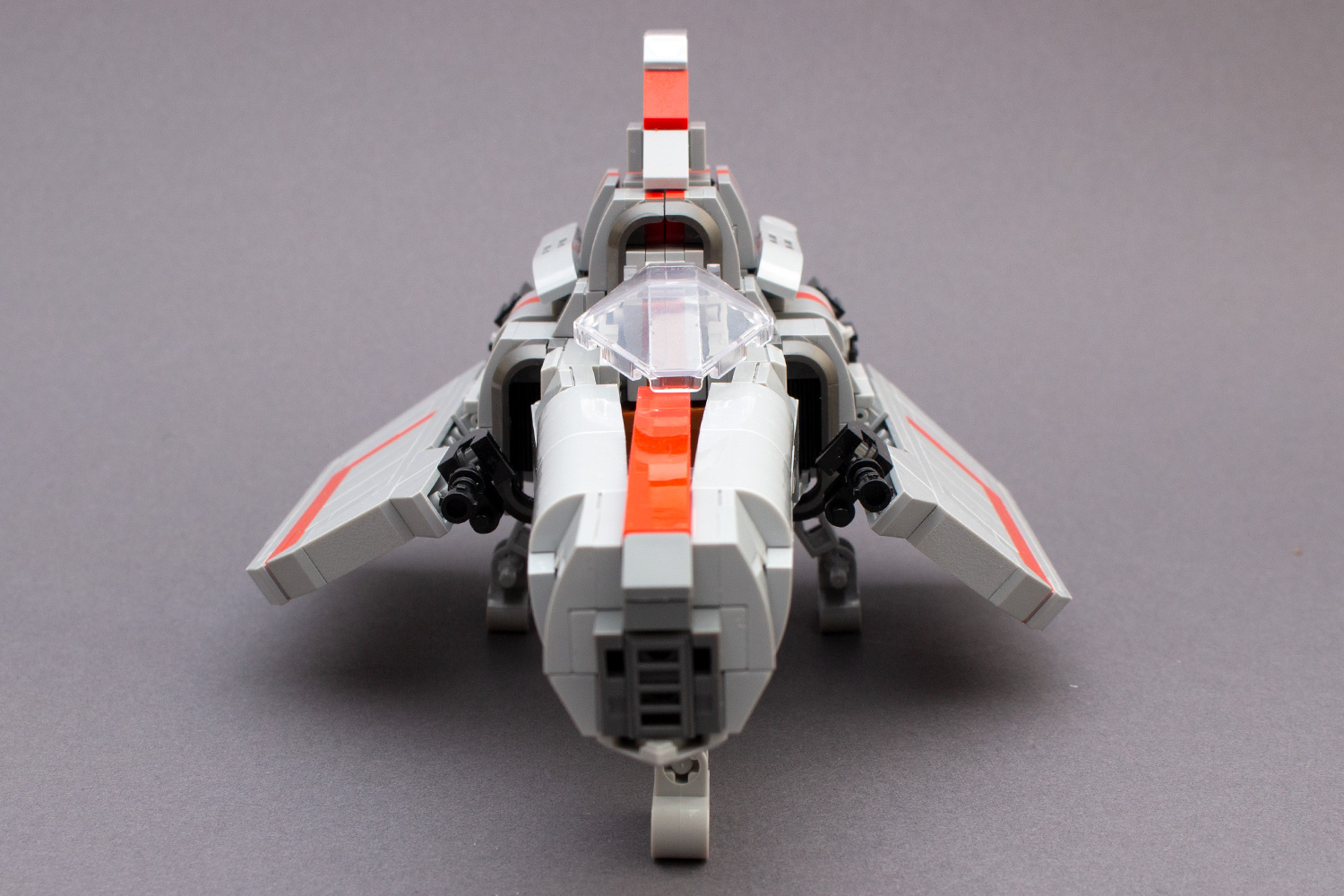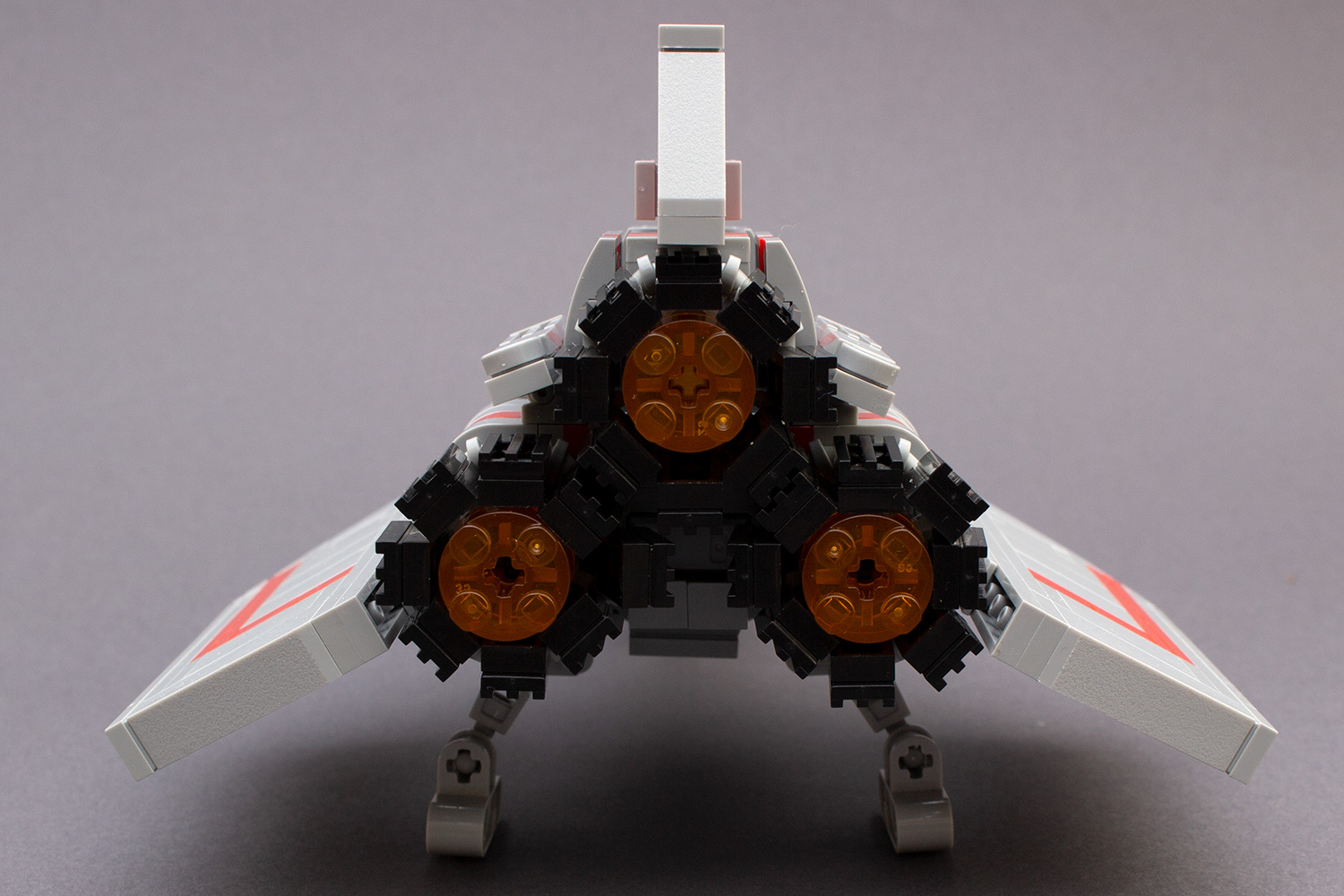 Mit der Front ist bereits die Hälfte des Bauvorganges geschafft, in der anderen geht es an die Fertigung des Hecks samt Triebwerken und der Flügel. Bei ersterem wird die Konstruktion noch einmal abenteuerlich: So wird der hintere Teil mit dem bereits gefertigten vorderen Teil über zwei Achsen, die durch die Triebwerke gedrückt werden sollen, stabilisiert. Im vorliegenden Modell waren die beiliegenden Achsen jedoch etwas kürzer als in der Anleitung angegeben, sodass diese, wenn sie soweit wie in der Anleitung vorgegeben eingedrückt wurden, die Triebwerke nicht halten konnten. Hierbei war ein Austausch während des Bauvorganges gegen längere Achsen notwendig. Der Vorgang wird jedoch durch die als Kühlrippen fungierenden dunkelgrauen 3×3 Hero Factory Weapon Barrels erschwert, welche ebenfalls in der richtigen Position gehalten werden müssen. Für den nötigen Druck ist eine geeignete Stelle zum Halten ebenso notwendig – welche es an dem Modell aber nicht wirklich gibt. Beim hiesigen Aufbau lösten sich daher mehrfach Teile oder die Triebwerke mussten wieder auseinander genommen werden – eine Geduldsprobe.