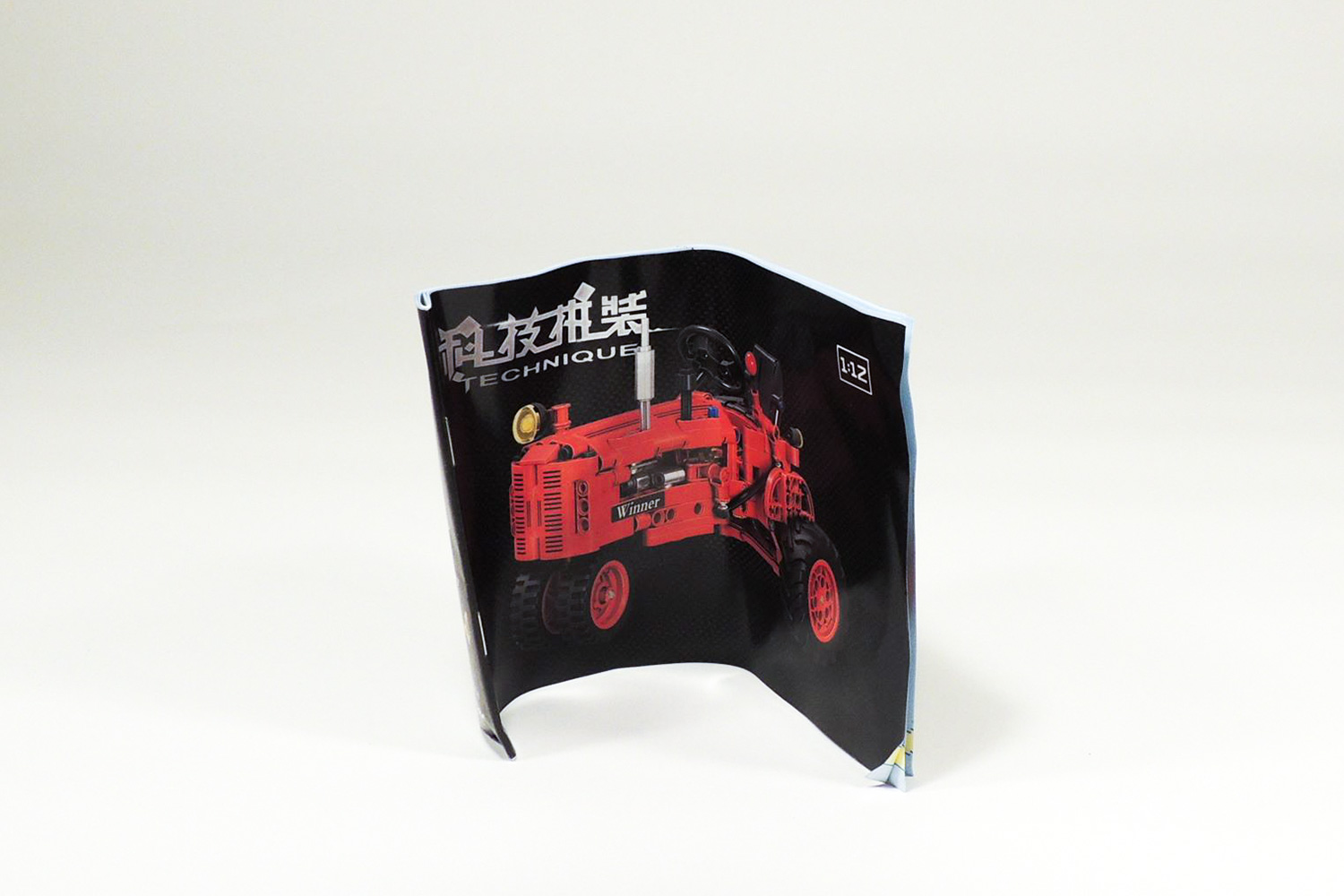 Das Deckblatt ist im Carbonlook gehalten, weist oben rechts den (falschen) Maßstab 1:12 aus und zeigt den zusammengebauten Traktor von schräg vorn. Oben links werden dazu als Text „科技拼装”(„ Wissenschaftliche und technologische Montage“) sowie „TECHNIQUE“ angegeben. Hierzu sei weiterführend angemerkt, dass in Ostasien und vor allem in China der Spielzeugkauf immer einen Bildungscharakter aufweisen muss – was jedoch eher als ein gesellschaftlicher Aspekt anzusehen ist.