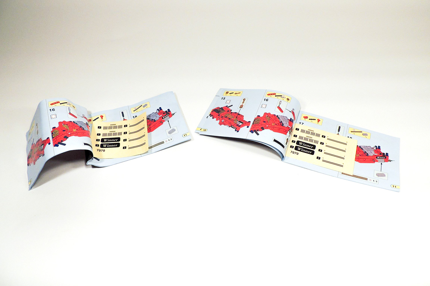 Die Anleitung ist vorbildlich sowohl in der Farbwiedergabe wie auch in der Erklärung der jeweiligen Bauschritte. Sie spielt auf sehr hohem Niveau und braucht den Vergleich mit Lego nicht zu scheuen – sie besitzt all das, was Lego seinerzeit bis in die 90er Jahre ausmachte: Das Beschränken auf das Wesentliche. Keine Werbung für Apps, Social Media oder andere optische Ablenkungen, bis auf die Rückseite des Deckblatts dreht sich alles nur um den kleinen roten Traktor. Dass die letzte Seite weitere Sets von Winner mit beiden Nummern jeweils als Kaufanregung anpreist ist geschenkt.