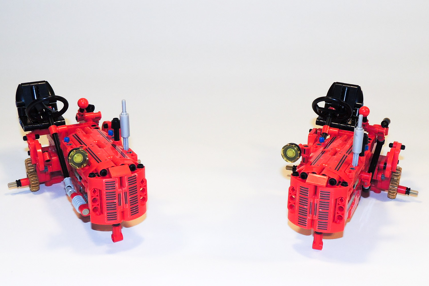 Enttäuschend, aber auch zu erwarten, ist der Unterschied zwischen dem Set 7070 und 1281, wobei ersteres erst nach gravierendem Umbau der Zahnräder taugt, das hier erhältliche Set fällt dagegen akzeptabel aus. Die halbe Pin in Dark Bluish Gray als Fehlguss im 1281 sowie die 5L Technic-Achse mit falschen Farbeinschlüssen im 7070 waren dagegen durch geschicktes Bauen zu verstecken oder aus dem eigenen Teile-Fundus zu ersetzen. Überraschend ist die Verwendung vieler Teile in ungewöhnlichen Farben, wie zum Beispiel Pearl Light Gray oder Pearl Gold, die bei Lego nicht erhältlich sind.