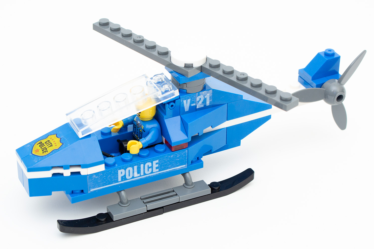Nach rund einer Stunde geht es an den Hubschrauber, welcher ein wenig die Schwachstelle des Sets bildet. Der Aufbau selbst geht schnell von der Hand und bedarf lediglich 15 Minuten. Bei diesem hätte Blocki jedoch ein wenig mehr Augenmerk auf die Ausarbeitung legen können, womit der Rotor durchaus formvollendeter hätte umgesetzt werden können. Die gleiche Bauzeit sollte auch für den in einer Breite von sechs Noppen gefertigten Polizeiwagen aufgebracht werden, welcher ebenfalls sehr einfach gestaltet wurde.