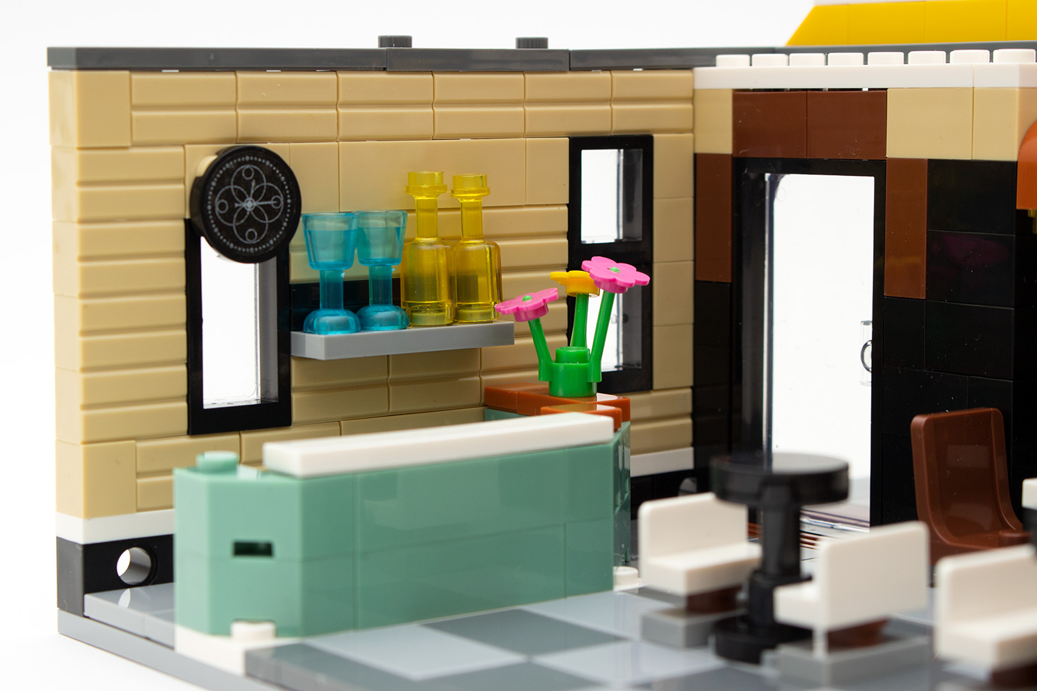 Mit den ersten beiden Bauabschnitten wird das Erdgeschoss gebaut, welches eine Theke und den Speisesaal beinhaltet – eine Küche besitzt das Restaurant nicht, das Essen wird also anscheinend geliefert. Direkt fällt auf, dass das Set nicht auf einer 32 × 32 Noppen großen Basisplatte gebaut wird, sondern die Grundfläche mit 22 × 24 Noppen kleiner ausfällt. Diese wird aus verschiedenen Platten mit Größen von 6 × 6, 16 × 6, 16 × 8 und 16 × 16 Noppen zusammengesetzt. Das Erdgeschoss wird in den nächsten Bauschritten zunächst komplett gefliest, sowohl auf dem Gehweg vor dem Gebäude wie auch im Inneren selbst. Lediglich die Bereiche, wo später die Stühle, Bänke, Tische und Lampen angebracht werden, werden mit Plates aufgefüllt. Bereits in den ersten Bauschritten wird deutlich, dass das Modell keine Rückwand besitzt und daher wie ein Puppenhaus bespielbar sein wird.