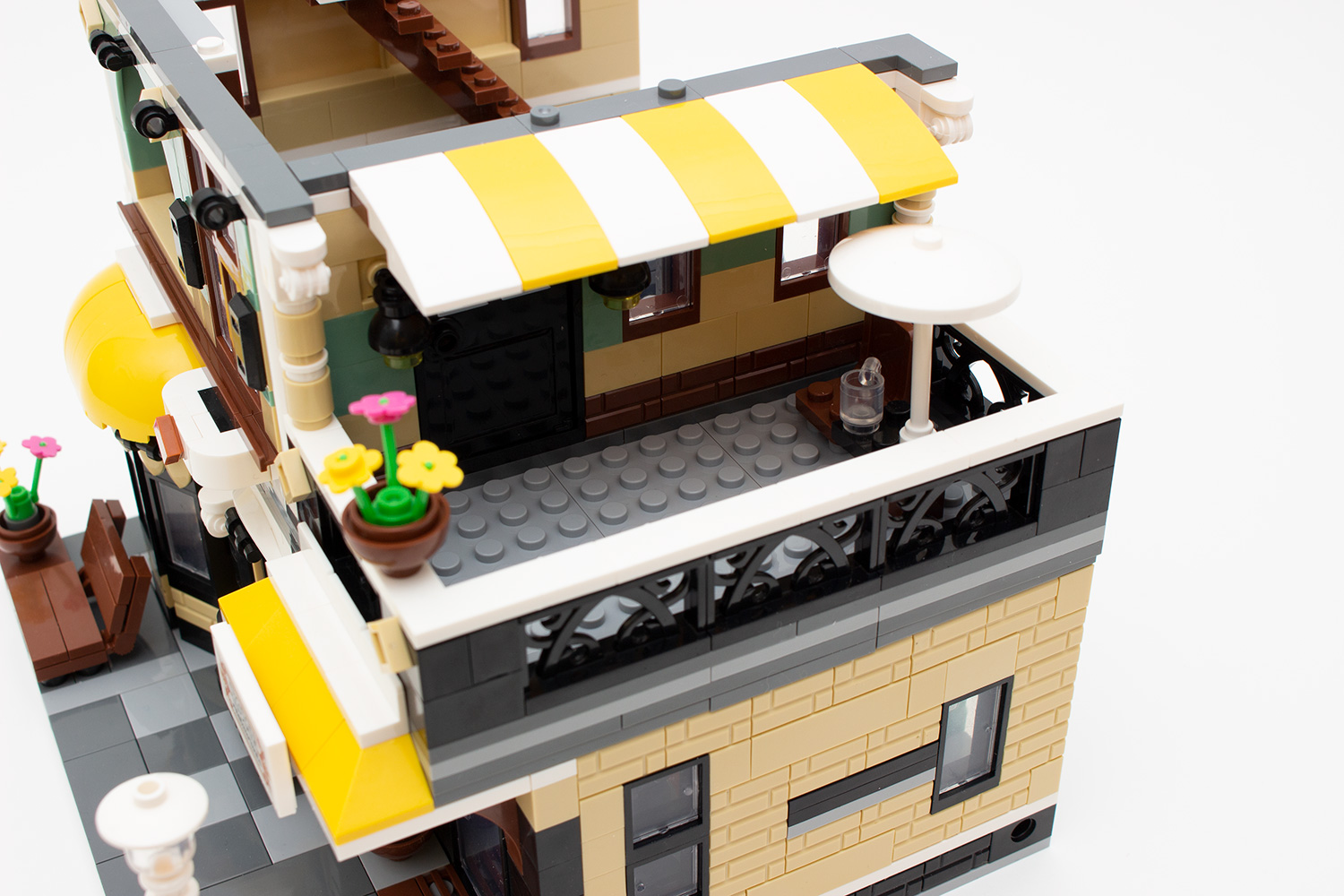 Ein kleines bespielbares Modell mit Modular-Eigenschaften – so würde sich das italienische Restaurant von Zhe Gao am besten beschreiben lassen. Das fertige Modell ist dabei schön gestaltet, vor allem was die kleinen Verzierungen überall angeht. Das äußere Erscheinungsbild ist daher sehr überzeugend. Etwas anders verhält es sich mit der Inneneinrichtung, welche am Ende doch etwas mager ausfällt. Für den geforderten Verkaufspreis hätte doch das eine oder andere Mobiliar mehr in die Verpackung gehört. Auch hätten einige Bereiche eleganter gelöst werden können, so wie die Kanten der nach innen versetzten, großen Fenster. Zudem fällt auf, dass sich das Modell dem Namen nach als ein Restaurant bezeichnet, eine Küche aber im fertigen Modell nicht einmal angedeutet ist – lediglich ein Tresen und ein Essbereich im Erdgeschoss sowie eine Wohnung über zwei Etagen mit Terrasse werden gebaut.