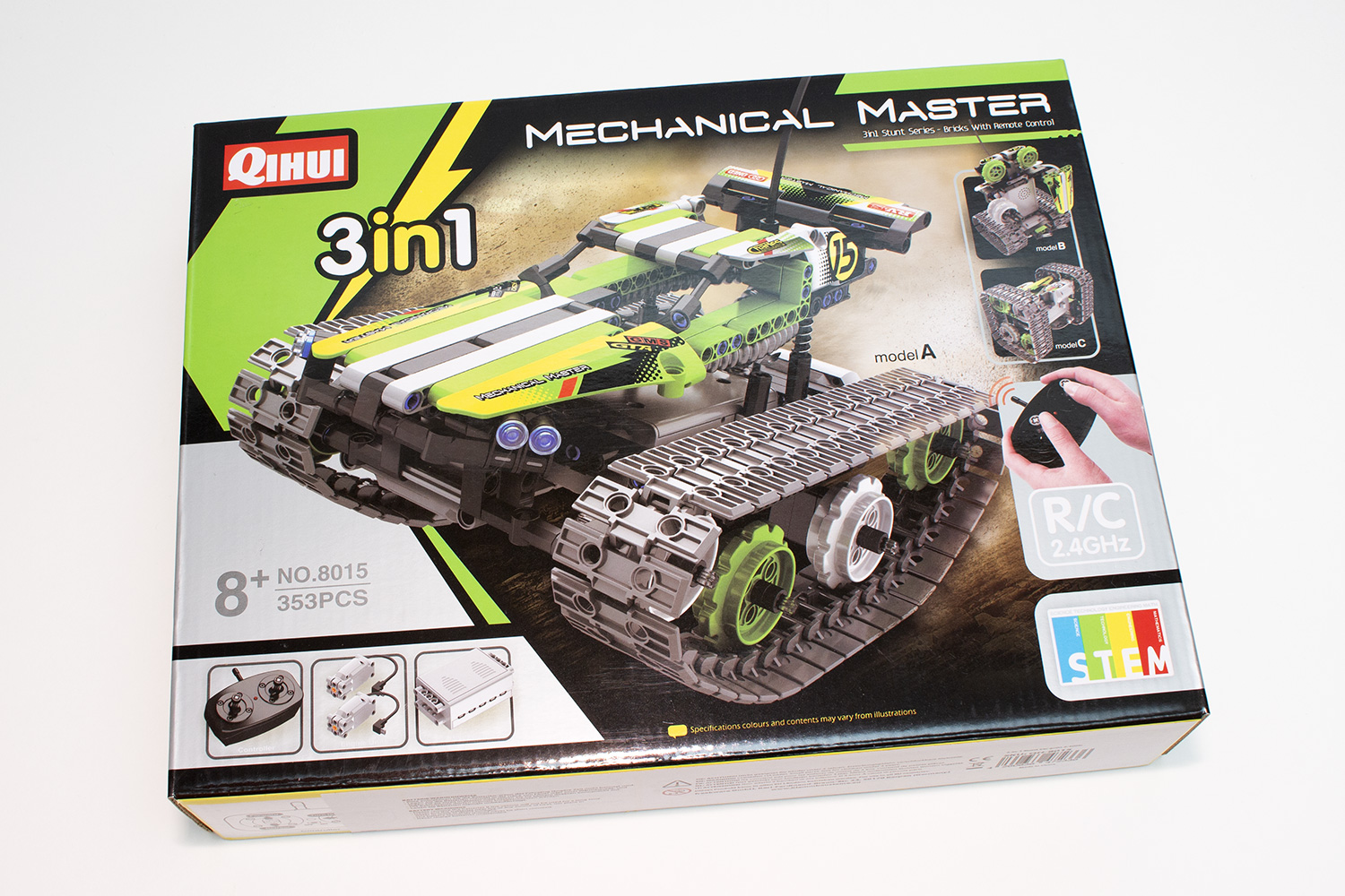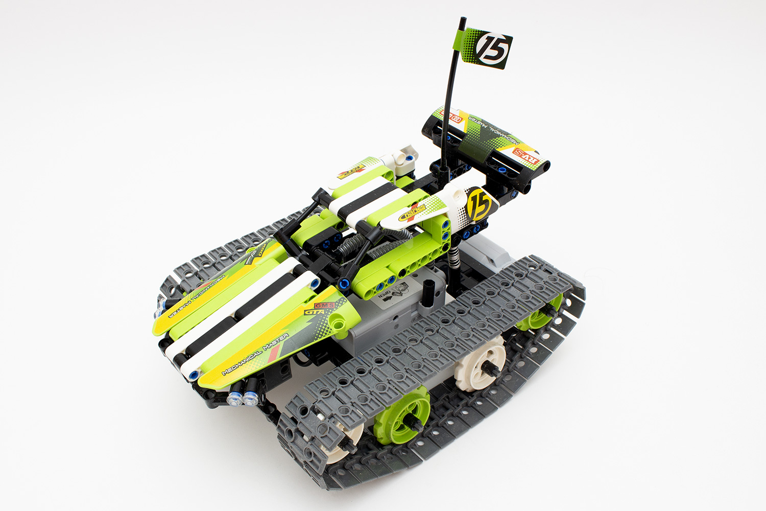 Mit seinen 353 Teilen erweckt das Stunt Car in Grün trotz seiner Fernsteuerung den Eindruck eines kleinen Modells für Zwischendurch oder verregnete Nachmittage, auch wenn es in seinem äußeren Erscheinungsbild sehr an den Tracked Racer (42065) von Lego erinnert. Für die in der Verpackung enthaltenen Technik-Teile, zwei Motoren, eine Akku-Box inklusive Empfänger sowie eine im 2,4-GHz-Band agierende RC-Bedienung werden bei den hiesigen Händlern rund 43 Euro fällig. Doch das Set hat einiges zu bieten, können mit diesem doch im Grunde drei verschiedene ferngesteuerte Modelle gebaut werden: Das bereits beschriebene Stunt Car, ein Roboter und etwas, was an einen kettenangetriebenen Quader erinnert. Auf der anderen Seite kann der Motorenuntersatz auch für eigene Vehikel und Kreationen Verwendung finden.