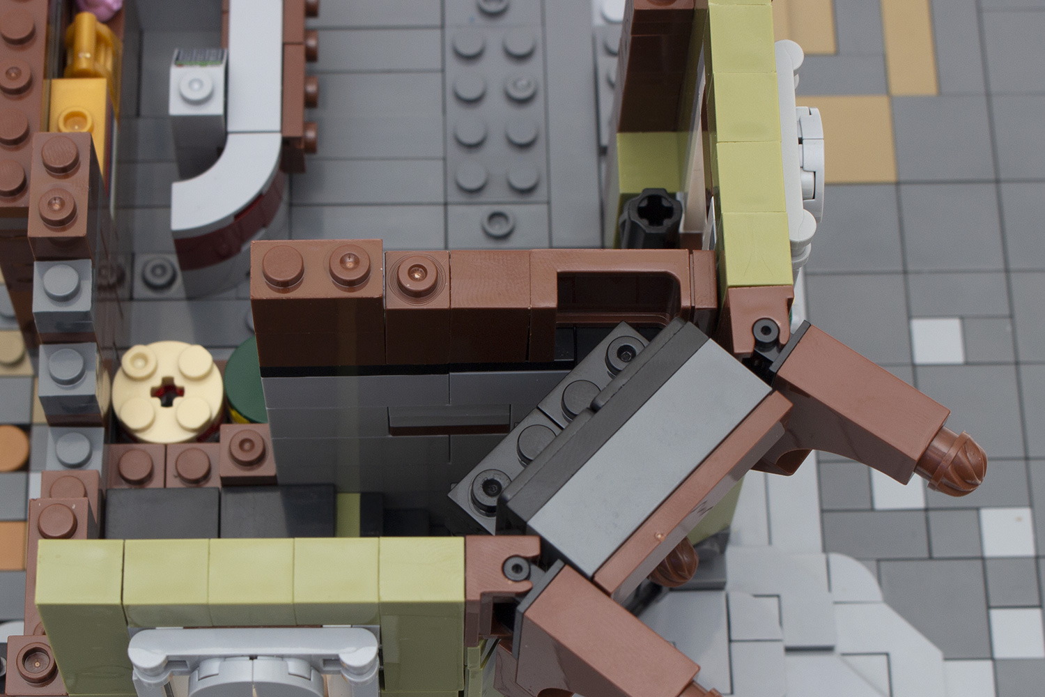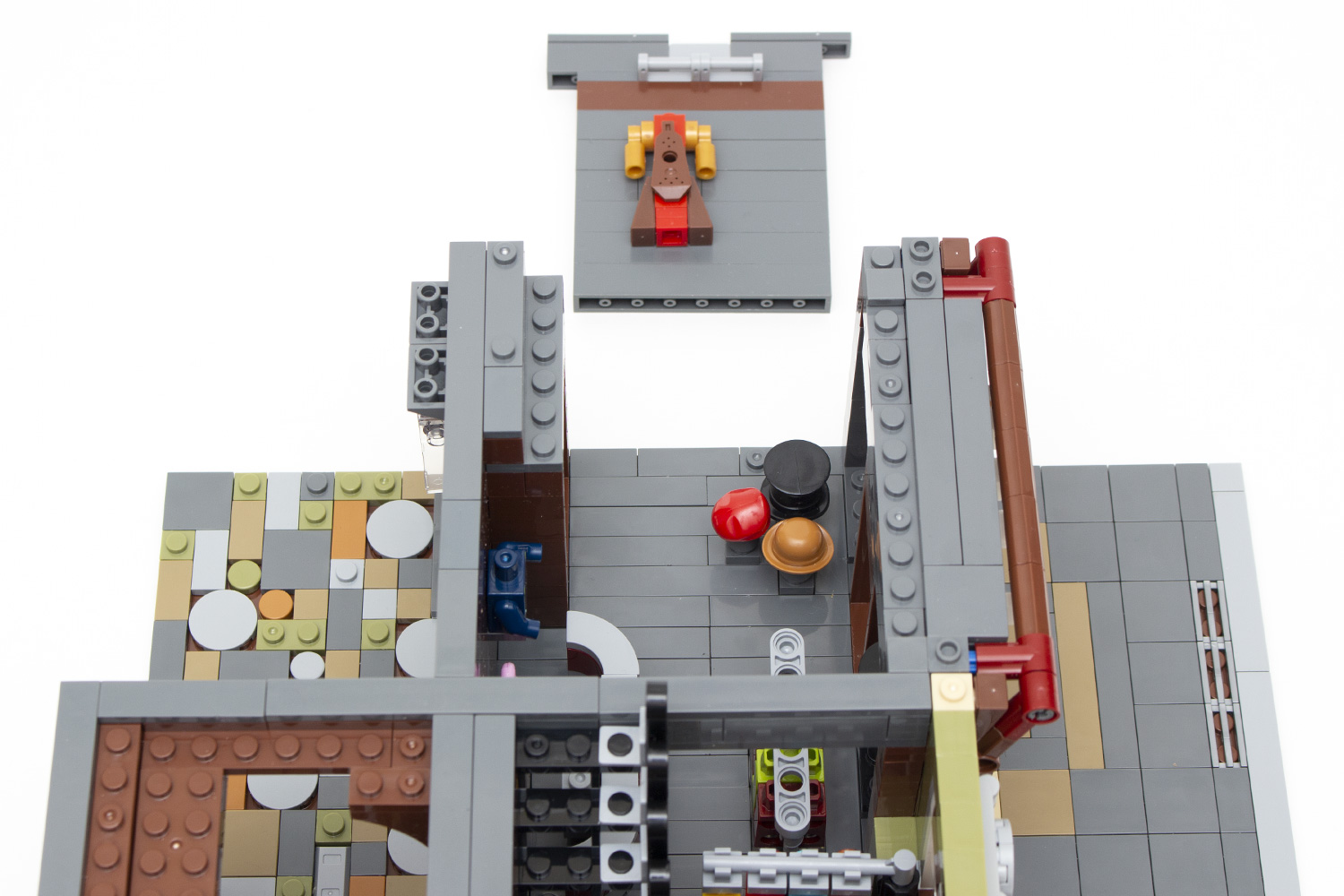 Das Dachgeschoss, welches in den letzten knapp drei Stunden gefertigt wird, hat es noch einmal in sich und wird ebenso zunächst mit zwei Schichten Plates begonnen. Nach Anbringen von ein paar Verzierungen wird auf den Streben des rechten Dachbodens ein Zugmechanismus gefertigt, dessen Funktion sich jedoch erst gegen Ende des Bauvorhabens offenbart. Bis dahin werden aber zunächst abwechselnd das Dach und der kleine Abschluss des bereits im ersten Stock begonnenen Erkers gefertigt. Auch hier greift der Designer des originalen MOCs für ein detaillierteres Äußeres auf viele verschiedene Bautechniken zurück. Bei dessen Dach kommen darüber hinaus Freunde des meditativen Bauens auf ihre Kosten, wenn insgesamt 166 kleine Dachziegel, auch als „Käseecken“ bekannt, akkurat auf Plates gesetzt werden sollen.