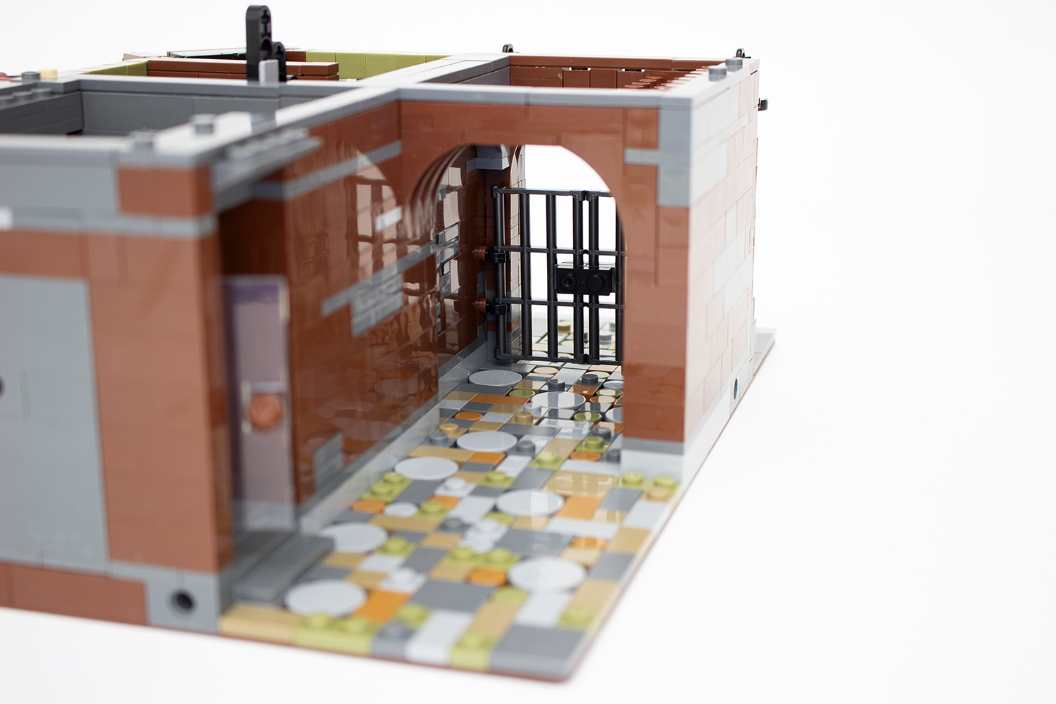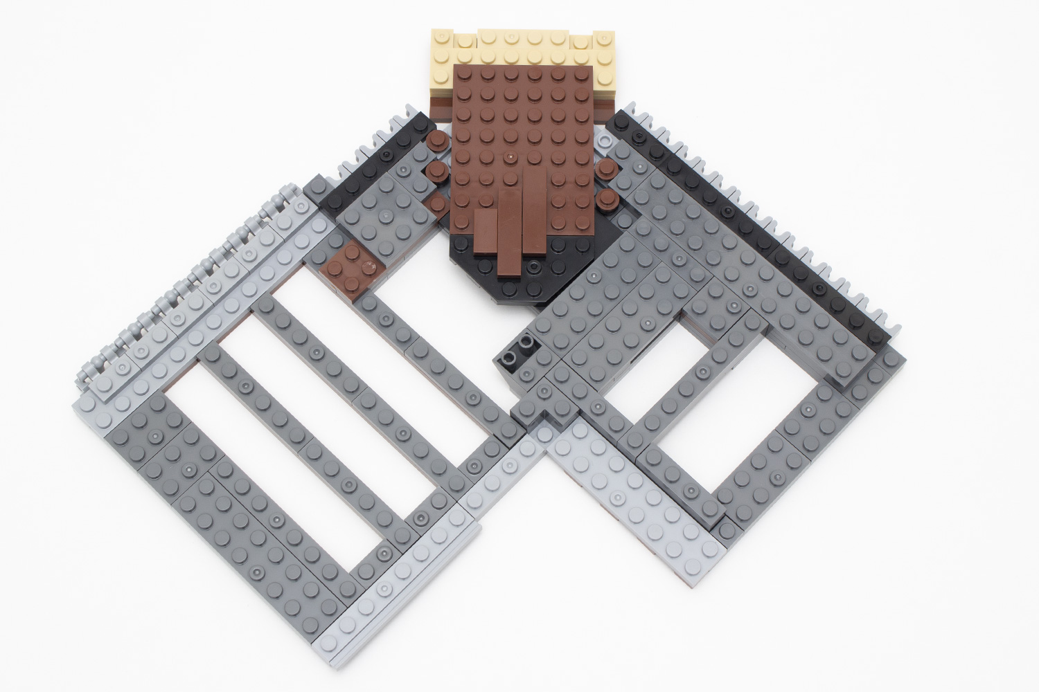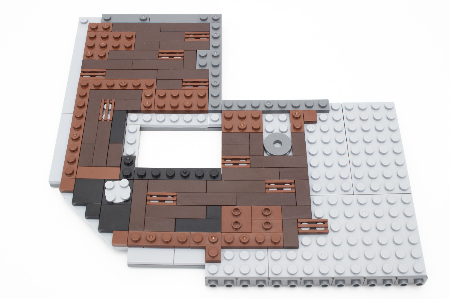 Anschließend werden Segmente gebaut, bei denen sich die Bedeutung erst viel später erschließt, und die mit dem Namen des Modells nicht zu tun haben wird. So wird eine Wasserstelle gebaut, welche zunächst auf eine Art Badewanne schließen lässt – was nicht ganz so verkehrt ist. So werkelt der Baumeister die erste der rund fünf Stunden Bauzeit für diese Etage vor sich hin, hoffentlich darauf bedacht, immer ein genaues Auge auf die Anleitung zu werfen. Da das bereits gebaute Werk sehr oft gedreht werden soll, kann schnell die Orientierung verloren gehen. Auf der anderen Seite erwartet diesen in den nächsten Abschnitten ein abwechslungsreicher Bau mit ebenso abwechslungsreichen Bautechniken. Als Erstes seien hier die Fenster der rechten Seitenwand genannt, welche sich aus den Teilen zusammensetzen, welche sonst meist als „Rückenlehnen“ der der Mini-Figuren oder als Halterungen verwendet werden. Weiter werden wie beim Erdgeschoss die beiden gründen Fassen als SNOT gebaut, also wieder von außen nach innen. Interessant sind dabei vor allem die Befestigungen, mit denen die beiden Segmente mit dem restlichen Bau verbunden werden und was diesen die Stabilität verleiht. Neulinge können gerade hier für eigene MOCs sehr viel lernen.