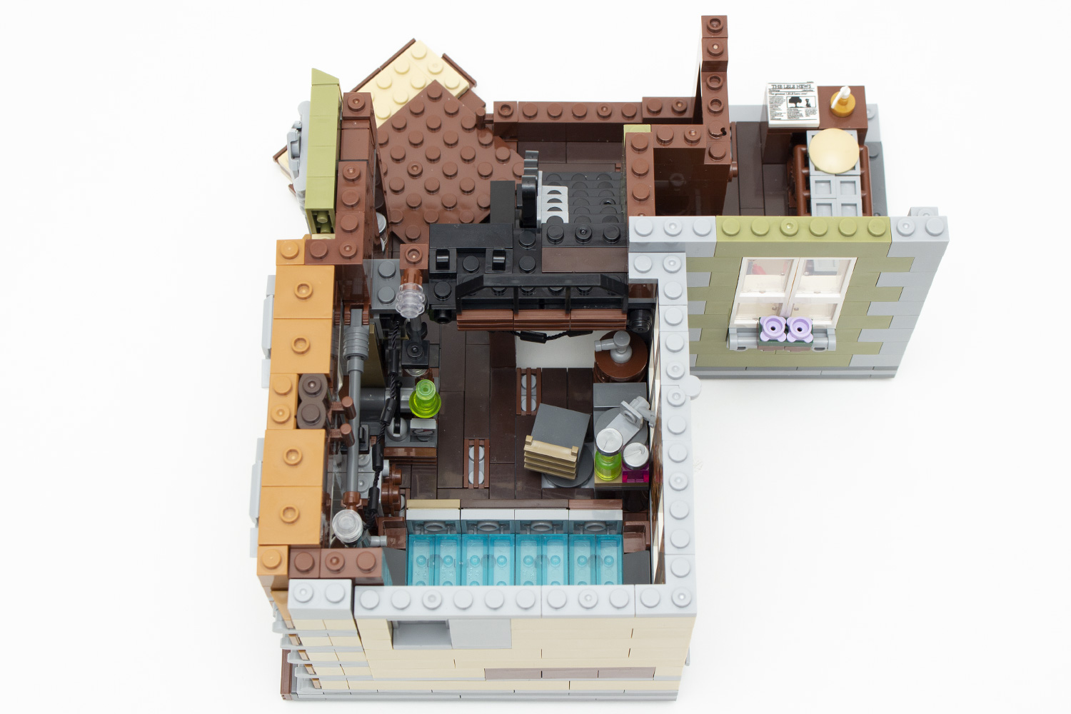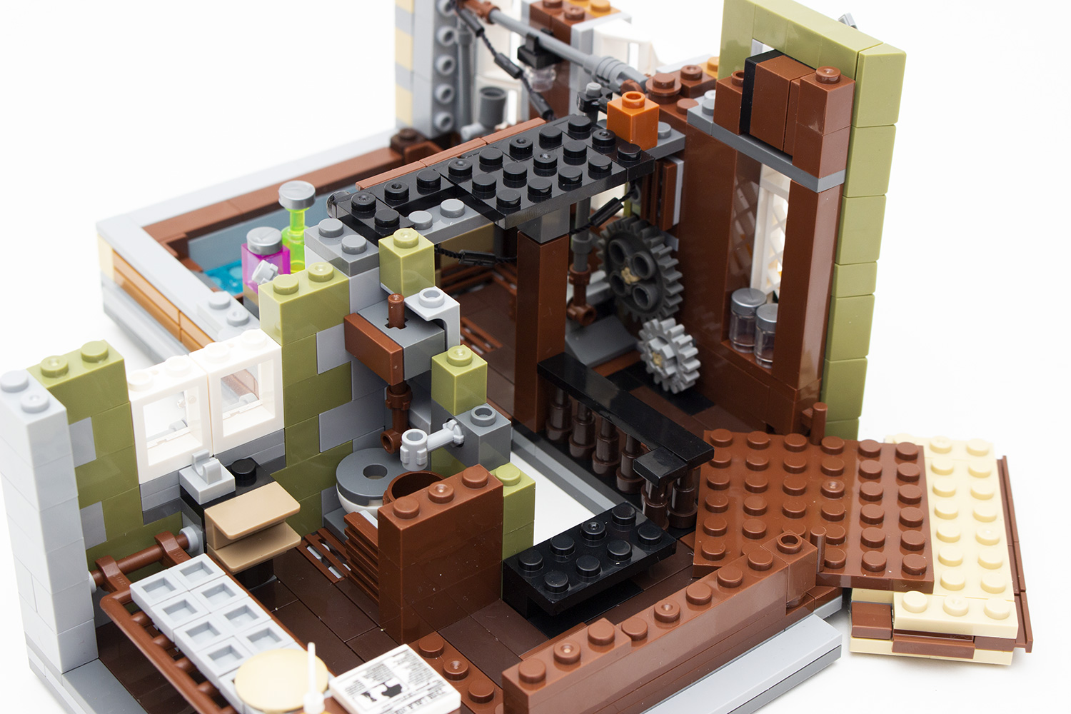 Dann baut der Baumeister weiter, fertigt Möbel wie den Schreibtisch, aber auch seltsame Apparaturen, welche erst einmal nicht zugeordnet werden können. Darüber hinaus verwendet das Modell eine Funktion, welche bisher in dieser Form in den Reviews von Just Bricks nur beim Music Store von Happy Build (Review) beobachtet werden konnte: Eine zu öffnende Rückwand, die den Blick auf das Innere freigibt – und der später noch benötigt wird.