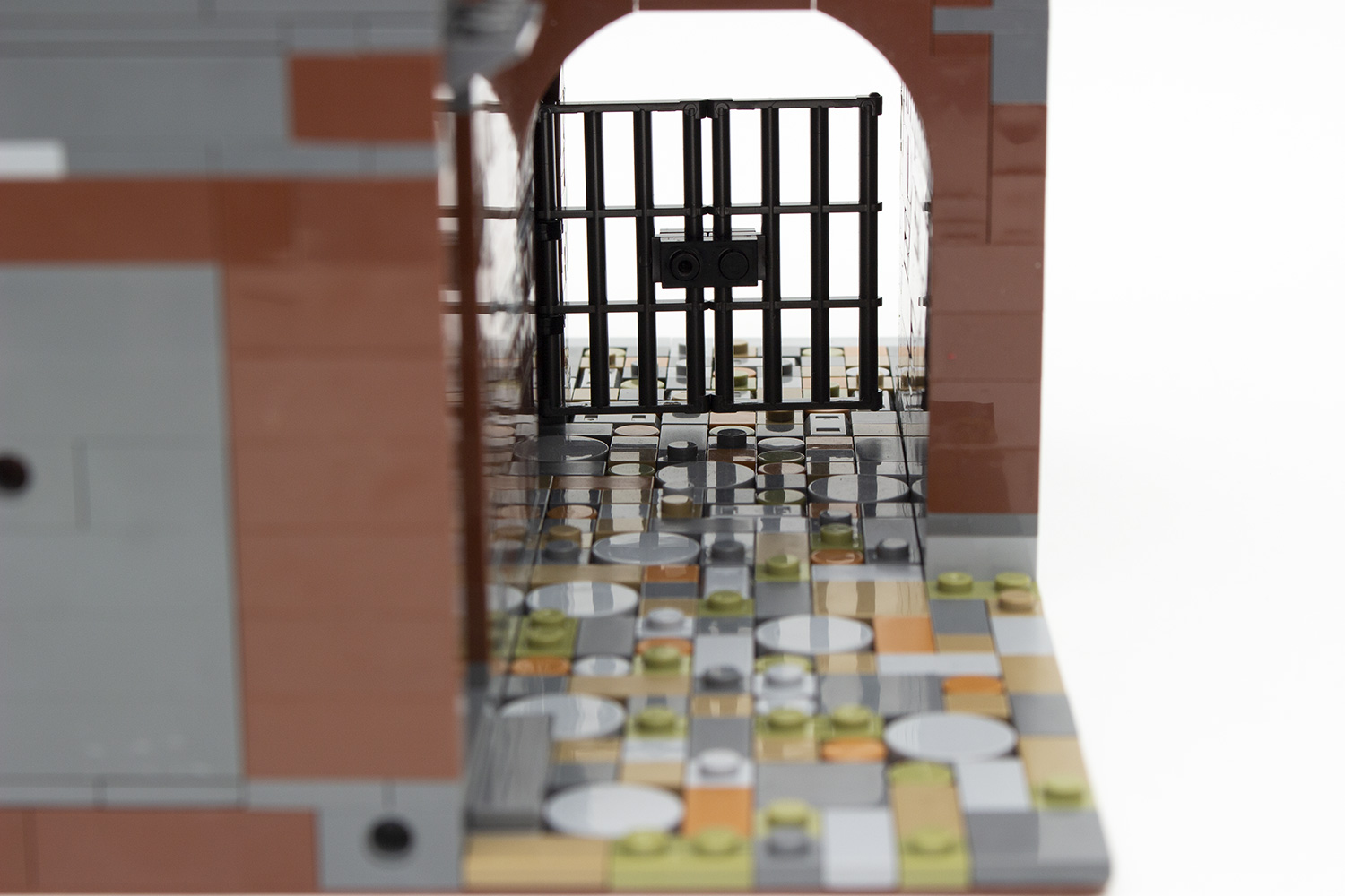 Der Zusammenbau der Figuren könnte auch etwas von einer Prüfung besitzen: Ist der Abschnitt erfolgreich gemeistert, stellt der Rest kein wirkliches Hindernis mehr dar. So darf der Baumeister nach diesen endlich an den eigentlichen Set-Aufbau, welcher für Modulars üblich mit dem Anbringen der Fliesen und der Grundfläche des Gebäudes auf der Basisplatte beginnt. Hier ist besondere Aufmerksamkeit gefragt, da gerade bei den kleineren Steinen des Weges, welcher später durch das Tor und den Torbogen führen wird, die richtige Reihenfolge zu beachten ist – rutscht der Blick einmal ab und schwindet die Orientierung, kommt auch die Klemmfolge durcheinander. Erschwert wird der Umstand durch die bereits beschriebene Diskrepanz zwischen den Farben in der Bauanleitung und der auf den Steinen. Hier vergeht erst einmal eine gewisse Zeit, bis der Baumeister erkannt hat, welche Fliesen in der Bauanleitung am Ende auch gemeint sind. Daher benötigt der erste Bauabschnitt mit zwei Stunden deutlich länger als es die Steineanzahl zu Anfang vermuten lässt.