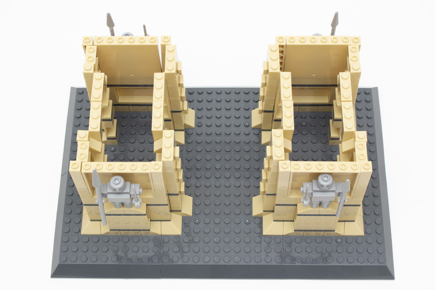 In den ersten Bauschritten werden die vier Pylone gebaut, welche im Grunde spiegelverkehrt zu den anderen geklemmt werden. Wichtig ist hierbei, die ersten Grundsteine an die richtigen Stellen zu setzen – ist dies nicht der Fall, lässt sich der spätere Bogen nicht anbringen. Ist dies vollbracht, müssen in den nächsten Bauschritten nur die richtigen Steine gesucht und gemütlich aufeinandergestapelt werden.