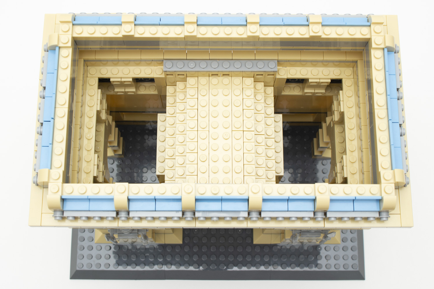 Als letzter Akt wird die Besucherplattform mit ihrer Mauer und Verzierungen sowie dem offenen Bereich auf dem Dach des Triumphbogens gebaut. Hier ist erneut ein wenig Feinarbeit gefragt, wenn 76 graue 1 × 1 Brick Modified mit Noppe an der Seite auf den Rand gesetzt werden sollen. An diese werden dann seitlich weitere Plates zur Verzierung angebracht, bevor auch das Konstrukt mit einem Ringanker aus 3 Lagen Plates stabilisiert wird. Anschließend müssen unter anderem noch eine Reihe 1 × 4 Bricks sowie noch einmal 16 graue kleine Brick Modified mit seitlicher Noppe, nur dieses Mal in Sandfarben, zusätzlich aufgesetzt werden. Noch hier und da ein paar runde 2 × 2 und 1 × 2 Noppen große, dunkelgraue Fliesen als Gestaltelemente angebracht und schon kann das Dach mit dem angedeuteten Ausgang für Besucher aufgesetzt werden. Zuletzt die Brüstung aufgeklemmt und das Modell ist nach insgesamt rund 4 Stunden fertiggestellt.