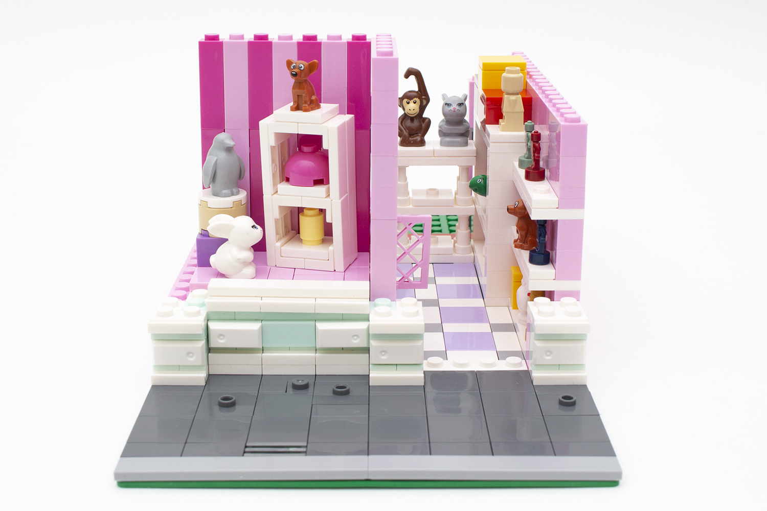 Mit dem ersten Bauschritt wird der auf den Produktbildern rechts gezeigte und namensgebende Spielwarenladen gebaut. Dies beginnt, wie eigentlich immer bei Modular-Modellen, mit dem Befliesen des Bodens, was trotz der verbauten 118 Teilen lediglich zwei Bauschritte in Anspruch nimmt. Anschließend wird begonnen eine der seitlichen Mauern hochzuziehen, wobei gleichzeitig auch mit der Inneneinrichtung begonnen wird. Im Laufe der nächsten Bauschritte werden Regale mit 20 Figuren besetzt, welche wohlmöglich Stofftiere darstellen sollen. Laut Anleitung sollten es derer 21 sein, bei einem grauen Drachen hat Xingbao jedoch die Maße nicht bedacht oder die Gussform nach dem Design des Modells wieder geändert. Das führt dazu, dass die seitliche Wand beim Aufsetzen des Tieres auf eine Noppe im Regal im Weg ist. Aber ein leerer Platz in den Regalen zeigt auch, dass die Lokalität gut frequentiert ist und auch Waren verkauft werden. Von diesen Regalen fertigt der Baumeister fünf Stück an, welche sich auf den Verkaufsraum verteilen – einige auch bereits als Dekoration für das im nächsten Abschnitt noch zu bauende Schaufenster samt Auslage.