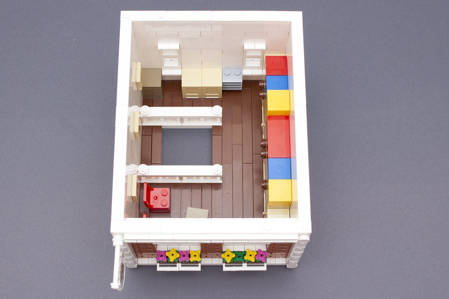 Darüber hinaus sorgt das Stockwerk zur Verwunderung und verleitet zu zunächst falschen Annahmen. So fällt das bei den Wandsteinen verwendete Weiß sichtbar dunkler aus, als es noch beim ersten Gebäude der Fall war – gegen die jetzt verbauten Steine wirkt dieses schon fast wie ein Alpin-Weiß. So könnte zunächst angenommen werden, dass Xingbao nach wie vor Probleme mit der gleichbleibenden Qualität seiner Steine besitzt. Ein genauerer Blick in die Anleitung nährt jedoch Zweifel an dieser Annahme, werden in dieser die genannten Steine doch ebenso in einer leicht anderen Nuance abgebildet, als es zum Beispiel bei Fliesen und Plates in der Wohnung der Fall ist. Daher kann angenommen werden, dass dieser Unterschied bewusst vom chinesischen Hersteller gewählt wurde – anders lässt sich diese Aufteilung nicht erklären. Für ein gleichmäßiges Äußeres wäre es dann aber ebenso von Vorteil gewesen, auch die geriffelten 1 × 2 Bricks im gleichen Farbton zu fertigen. Gleiches gilt für die kleinen Fenster, welche in der Bauanleitung ebenso heller dargestellt werden.
