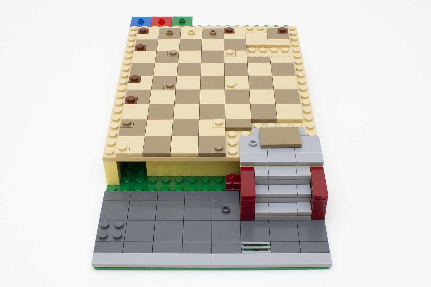 Ein wenig aufgepasst werden muss lediglich bei der Front, bei der, im Gegensatz zum unteren Ende der Wand und bei den Fenstern, die 1 × 2 Noppen großen Plates mit einer Noppe am Wandabschluss ausgerichtet werden. Wer hier nicht aufpasst, kann sich schnell verbauen und dann passt der aus einer Lage Plates und darauf Fliesen gefertigte Ringanker vorne nicht mehr.