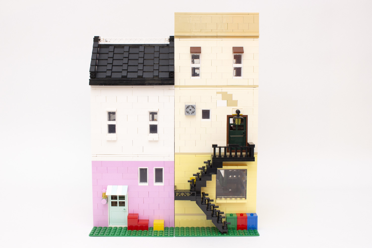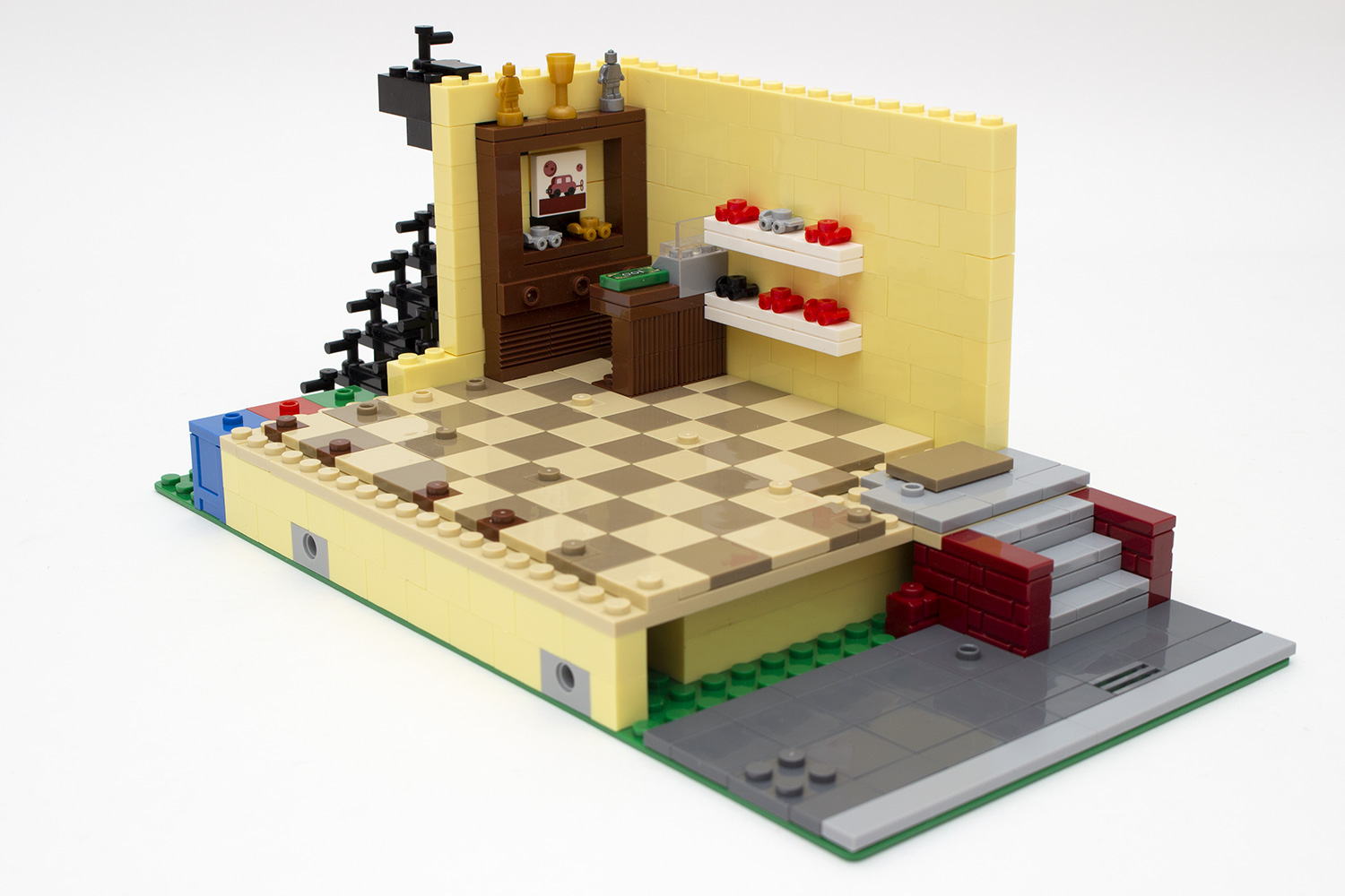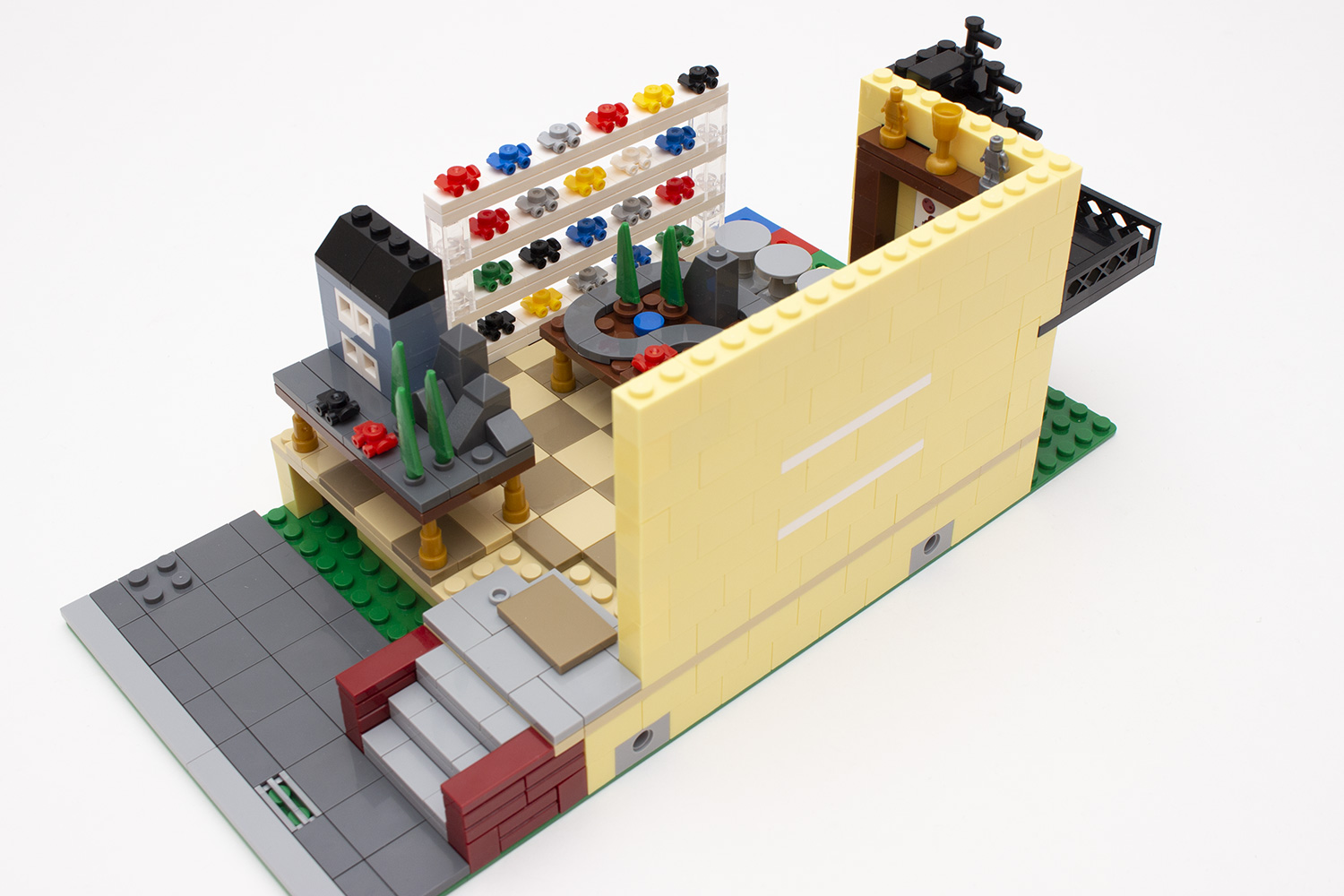 Beim zweiten Gebäude dürfte der Baumeister schnell der Annahme verfallen, dass dieses genauso begonnen wird, wie es beim vorangegangenen Teil der Fall war. Dem ist aber nicht ganz so. So ist bei diesem das Erdgeschoss um zwei Steineeinheiten höher gelegt, sodass das Erdgeschoss einer Treppe bedarf. Auch bei diesem zeigt sich die Teileverschwendung seitens des Herstellers im Inneren des sich nun eher an Jungs richtenden Verkaufsraumes. Nachdem das Geschäft auf der anderen Seite 20 Figuren beinhaltet, werden bei diesem 33 der kleinen Teile verbaut, welche neben Autos auch oftmals als Darstellung von Rollschuhen genutzt werden. Diese sind neben den Regalen auch auf einer mitten im Raum gebauten Rennbahn sowie im Schaufenster zu sehen. Im Laufe des Bauvorganges werden bei dem Erdgeschoss, wie bei der anderen Haushälfte, aus kleinen Teilen die Wände hochgezogen, dieses Mal jedoch in einem kräftigen Zitronengelb. Darüber hinaus besitzt das Gebäude keine innere Treppe nach oben, der Nutzer muss die Wohnung darüber über eine Treppe von außen erreichen, die ebenfalls gebaut wird. Die Front ist in diesem Fall zwar etwas nüchterner und ohne große Verzierungen gehalten, ist aber in sich dennoch stimmig und passt zum Rest.