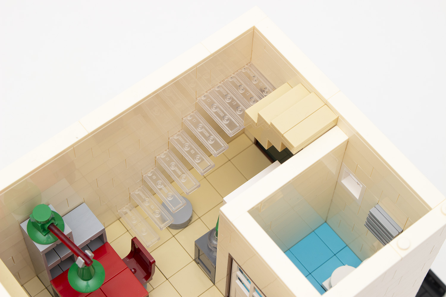 Mit dem vorletzten Abschnitt wird dann die kleine Wohnung über dem Spielzeugladen gebaut, die eine größere Küche und ein kleines Badezimmer beinhaltet. Auch dieses Segment beginnt mit der Fertigung des Bodens und dem Fliesenlegen. Anschließend wird erneut Stück für Stück mit dem Aufbau der Mauer und dem Interieur begonnen, wobei letzteres teilweise in die Wand eingearbeitet wird. Einen besonderen Hingucker stellt dabei die transparente Treppe ins darüber liegende Stockwerk dar, welche ebenso in die Mauer integriert ist. Bis dahin ist es aber ein etwas hakeliger Aufbau, da das Wandsegment zunächst außerhalb des Bodens zusammengesetzt wird wobei die Stellen, an denen die Treppenstufen eingelassen werden, schon fast wie eine Sollbruchstelle wirken. Hier ist somit ein wenig Fingerspitzengefühl gefragt.