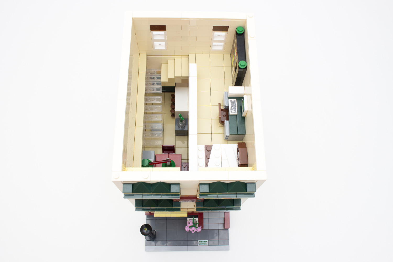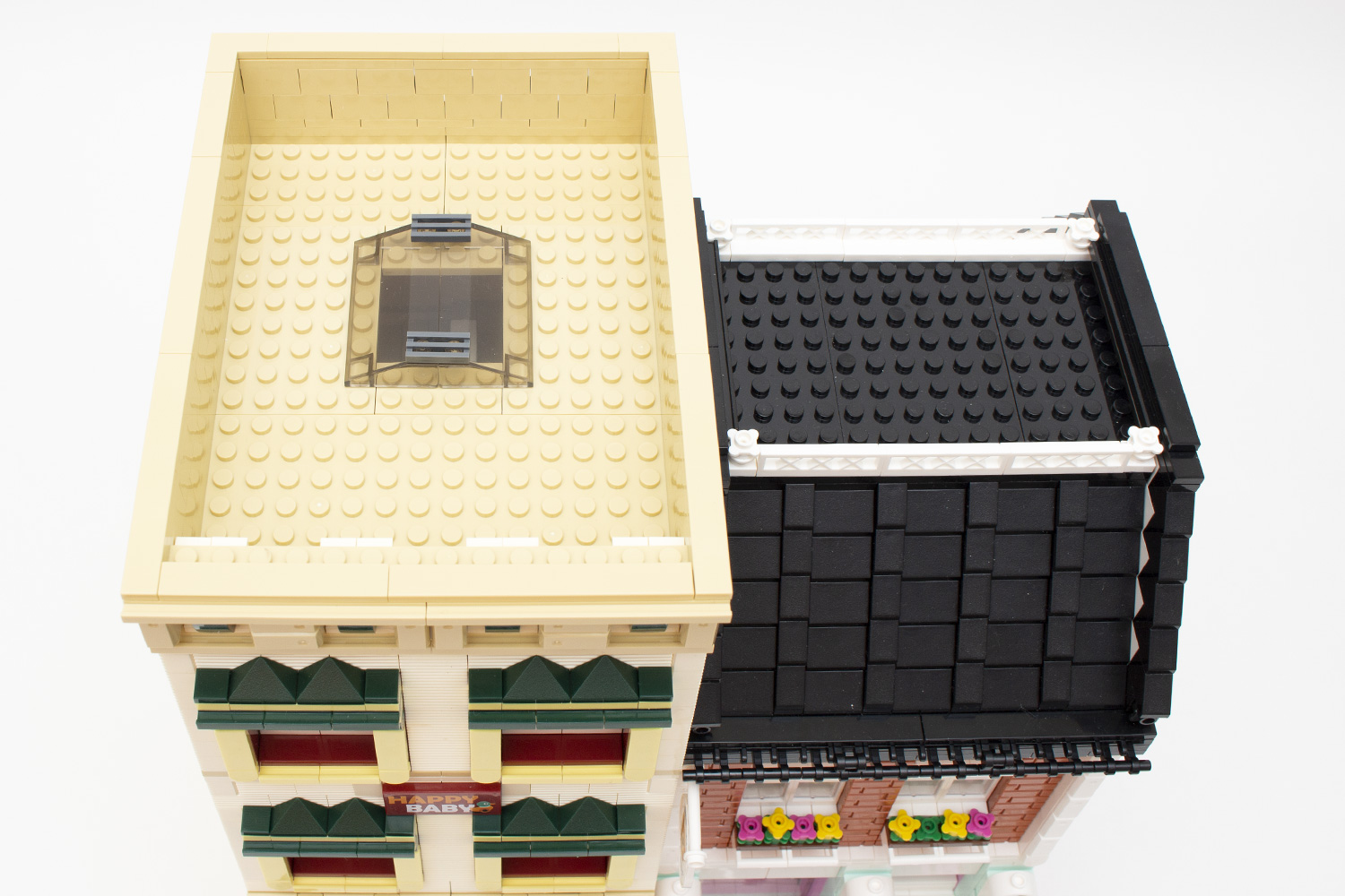 Im Gegensatz zum bereits auf Just Bricks getesteten Blumenladen (XB-01008) (Review) besteht das vorliegende Modell im Grunde aus zwei Gebäuden, welche zwar, wie auf den Produktbildern und in der Anleitung aufgeführt, nebeneinander aufgestellt, aber auch getrennt genutzt werden können, um eventuelle Lücken in der eigenen Klemmbausteinstadt zu füllen. Dies wird auch an den beiden mit 32 × 16 Noppen belegten Grundplatten schnell deutlich, welche dank der guten Lagerung nicht verbogen sind.