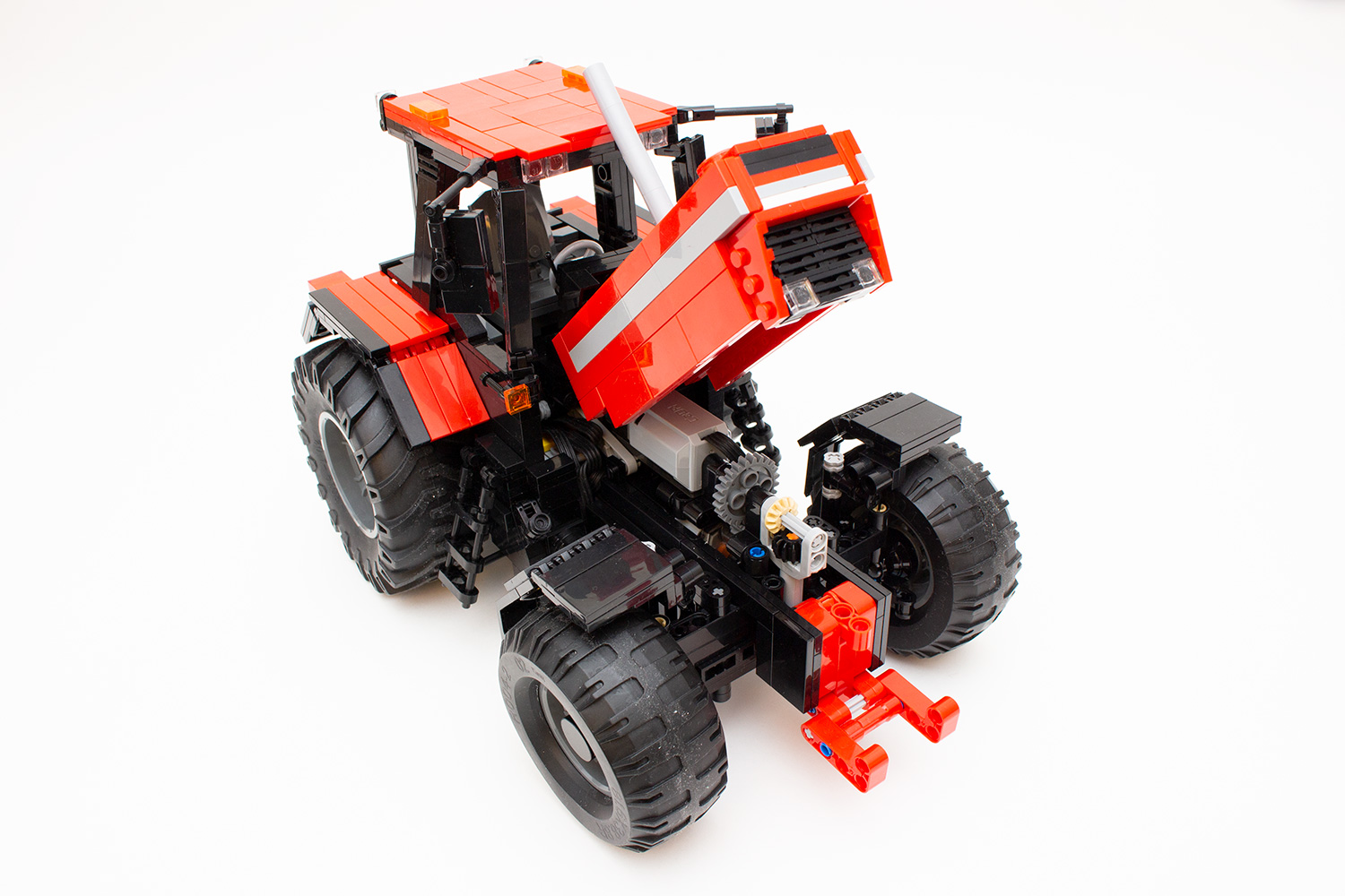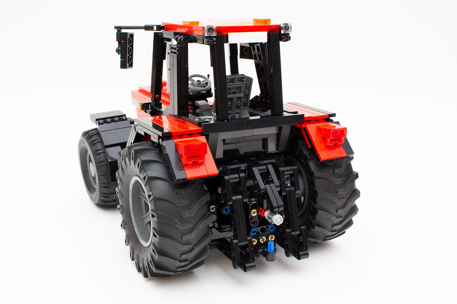 In den folgenden etwas mehr als 100 Bauschritten geht es vornehmlich um die Verkleidung. Zunächst werden die Seitenteile unter dem Fahrerhaus angebracht und die seitlichen Leitern daraufgesetzt. Zu diesem Zeitpunkt wird eine Sache aber klar: CaDA hat an manchen Stellen immer noch Probleme mit Konnektoren oder Einschüben für Achsen, was manche Segmente doch etwas weniger stabil macht. Beim italienischen Sportwagen ist das nicht so in Erscheinung getreten, da sich viele Module gegenseitig stabilisiert haben, beim vorliegenden Traktor gibt es aber Stellen, an denen dies nicht möglich ist. So lösen sich die drei Löcher langen 1/3-Liftarme für die Hebevorrichtung am Heck bereits bei Berührung, was beim Bauvorgang öfters passierte und recht nervig ist. Die Achsen selbst halten bei anderen Teilen völlig normal, womit sich der Verdacht um den Schuldigen verhärtet. Das ist auch in der Hinsicht verwunderlich, da diese Probleme beim Review des Multi-Funktions-Laders nicht mehr aufgetreten sind und diese daher als gelöst vermutet wurden.