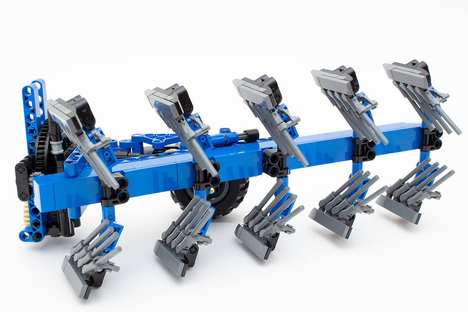 Die Möglichkeiten des Pfluges sind dagegen pfiffig gelöst. Dieser kann über die Schultertasten der Fernbedienung gehoben und gesenkt sowie gedreht werden. Letzteres ist aber erst ab einer gewissen Höhe möglich, erst dann greifen zwei Zahnräder ineinander. Somit muss dieser nach der Fahrt zunächst gedreht werden, damit der Scharren in Richtung Boden zeigen. Erst danach kann das Konstrukt abgesenkt werden. Wird dieser nicht mehr benötigt, wird das Prozedere in umgekehrter Richtung durchgeführt. Über den Boden sollte der Pflug jedoch nicht fahren, die Scharren könnten sich schnell lösen, da diese nur über zwei Noppen befestigt sind – das Modell ist auch hier mehr ein Vitrinenmodell.
