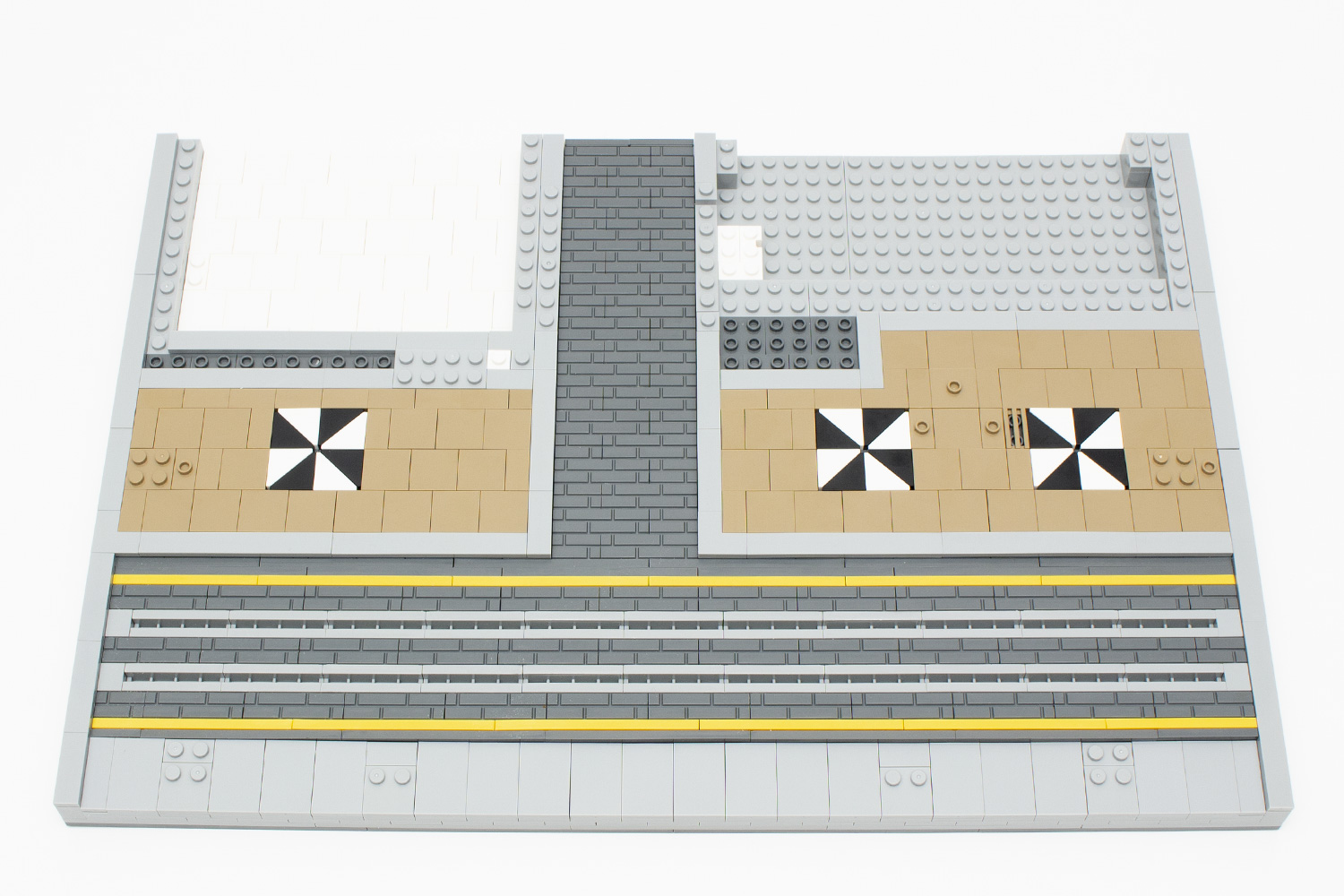 Der Bau des mit einer Grundfläche von 48 × 33 Noppen versehenen Modells beginnt mit der Erstellung der Grundplatte, welche später das Bauwerk tragen wird. Hier greift der Designer nicht auf die typischen Basisplatten zurück, sondern legt zwei Schichten Plates übereinander, wobei die obere Schicht aus sechs 16 × 16 Noppen großen Platten sowie mehreren kleineren Plates mit einer Noppe Breite zusammengesetzt wird. Dies geht generell einfach von der Hand, erfordert aber einige Kraft in den Fingern. Dafür ist die so selbst erstellte Grundplatte wiederum recht stabil. Anschließend wird zunächst, aus hauptsächlich 2 × 3 Noppen großen Plates sowie mehreren genauso großen Fliesen, eine kleine Erhebung gebaut.