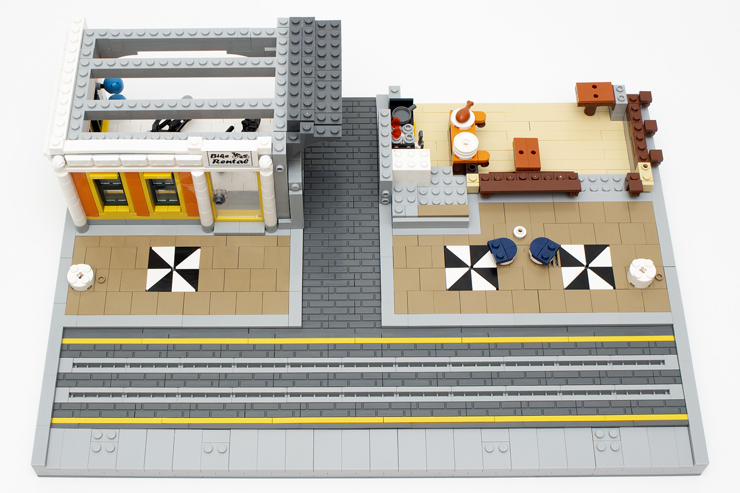 Am meisten überzeugt das Modell aber durch seine tollen Bautechniken. Das fängt mit der als Mauer gebauten und dann gelegten Straße an, die dadurch eine wunderschöne Pflastersteinoptik erhält, durch 1 × 2 Brick Modified mit Noppen an den Seiten, durch die das Konstrukt auch Noppen nach oben erhält und auf die die vor dem Gebäude befindlichen Fliesen angebracht werden können, der ausgebaute Tunneldurchgang zwischen den beiden Häusern sowie die Treppe bieten vor allem angehenden MOCern viele Inspirationen für zukünftige eigene Modelle. Auch an andere Kleinigkeiten wurde gedacht: So besitzen die Fahrräder einen um 90° gedrehten Lenker – womit gleich zwei Fliegen mit einer Klappe geschlagen werden könnten: Zum einen werden in dieser Form üblicherweise Fahrräder zu den Händlern geliefert und oftmals auch ausgestellt, was somit eine gewisse Detailtreue bedeutet, auf der anderen Seite dürfte der Hersteller damit eventuell vorhandene Geschmacksmuster umgehen. Auf der anderen Seiten dürften die Fahrräder in dieser Form in einem normalen Stadtbild weniger zum Einsatz kommen.