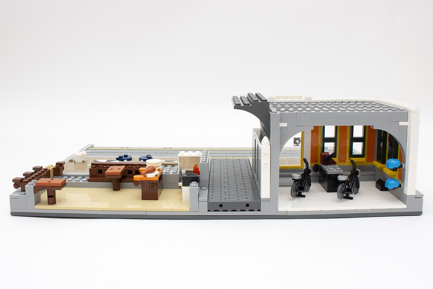 Die erste interessante Umsetzung erfolgt mit der Darstellung der Pflastersteine an den Schienen und dem kleinen Durchgang in der Hausmitte. Diese werden nicht wie so oft durch Fliesen dargestellt, sondern in diesem Fall durch seitlich gelegte Maustersteine. Bei dieser als SNOT (Studs Not On Top) bezeichneten Bautechnik werden die Steine mit den Noppen nach vorne, Reihe für Reihe gebaut. Diese Bauweise wurde unter anderem beim Lego Ideas-Set Central Perk (21319) für die Teppiche verwendet und mit in das „Friends Cafe“ von Mould King (Review) übernommen. Auf ähnliche Weise wurde auch ein Teil des Bodens samt Mosaik im Erdgeschoss des Maritimen Museums von Xingbao umgesetzt. Das von der Straßenbahn benötigte Gleisbett samt Schienen wird dabei durch Brick Modified 1 × 4 with Groove, also einem 1 × 4 Noppen großen Stein mit einem Schlitz in der Mitte, angedeutet.
