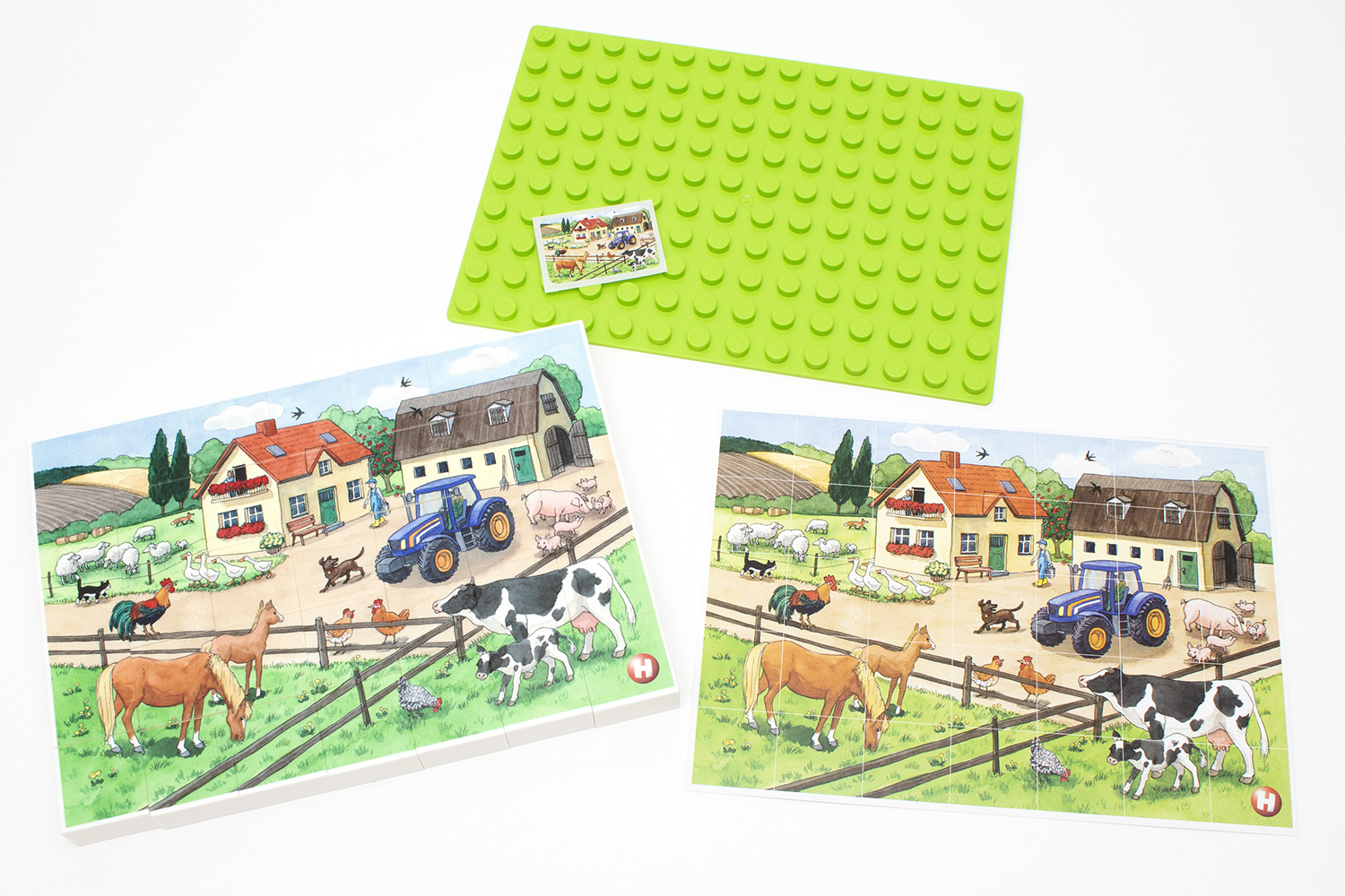 Jedem Puzzle liegt ein Bild im gleichen Raster für den ersten Aufbau beiFür seine Puzzles ruft der Hersteller einen UVP von knapp 20 Euro. Die Verpackung beinhaltet neben den 35 einzelnen Steinen in einer Größe von 2 × 2 Noppen, welche in ihrer Beschaffenheit den Duplo-Steinen des dänischen Marktführers entsprechen, auch die bereits beschriebene grüne Grundplatte. Für die ersten Gehversuche mit dem am Ende rund 22,5 × 16 cm großen Puzzle legt der Hersteller ein gleich großes Bild, an das sich Kinder orientieren können, sowie einen kleineren Aufkleber mit gleicher Darstellung bei.