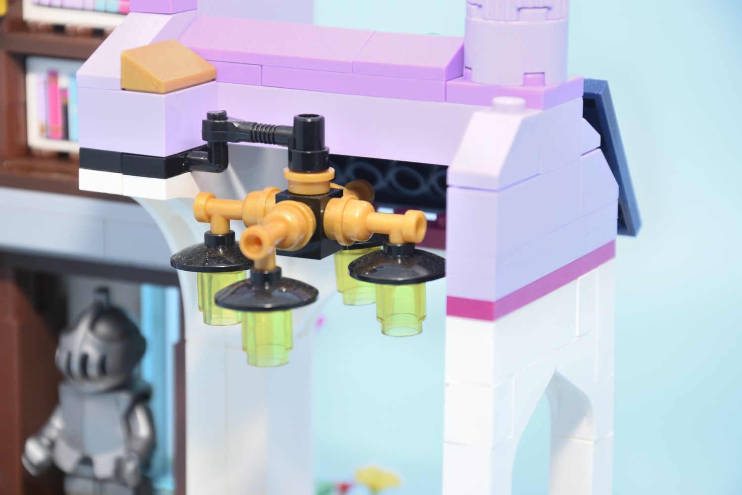 Weiter geht es mit dem Bau des Obergeschosses, welches später über die eben genannte aber bisher noch nicht angeklemmte Leiter erreichbar ist. Ein hier gebautes Teleskop oder Fernrohr lässt zunächst Freude aufkommen. Da es jedoch keinen Astronomie-Raum in dem Modell gibt und auch kein Platz für eine der Minifiguren neben diesem vorhanden ist, wird diese Freude leider ein wenig getrübt. Vielmehr lagert das Teleskop nur neben den Bücherregalen, welche in den folgenden Schritten gebaut werden. Zudem ist dieses Teleskop eigentlich auch nicht anderweitig gut im Spiel einsetzbar, da es stets auf einer Noppe aufgeklemmt werden muss.