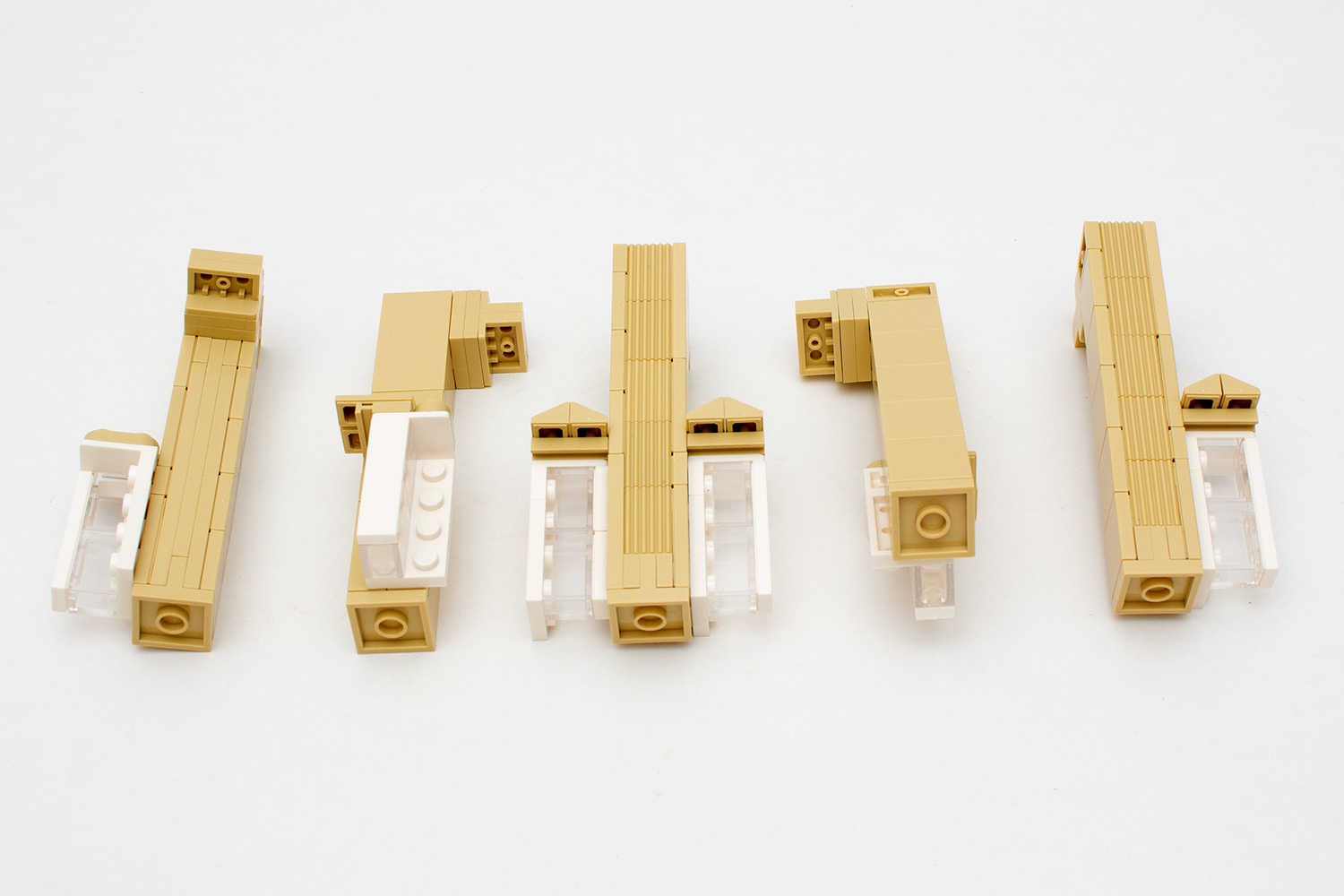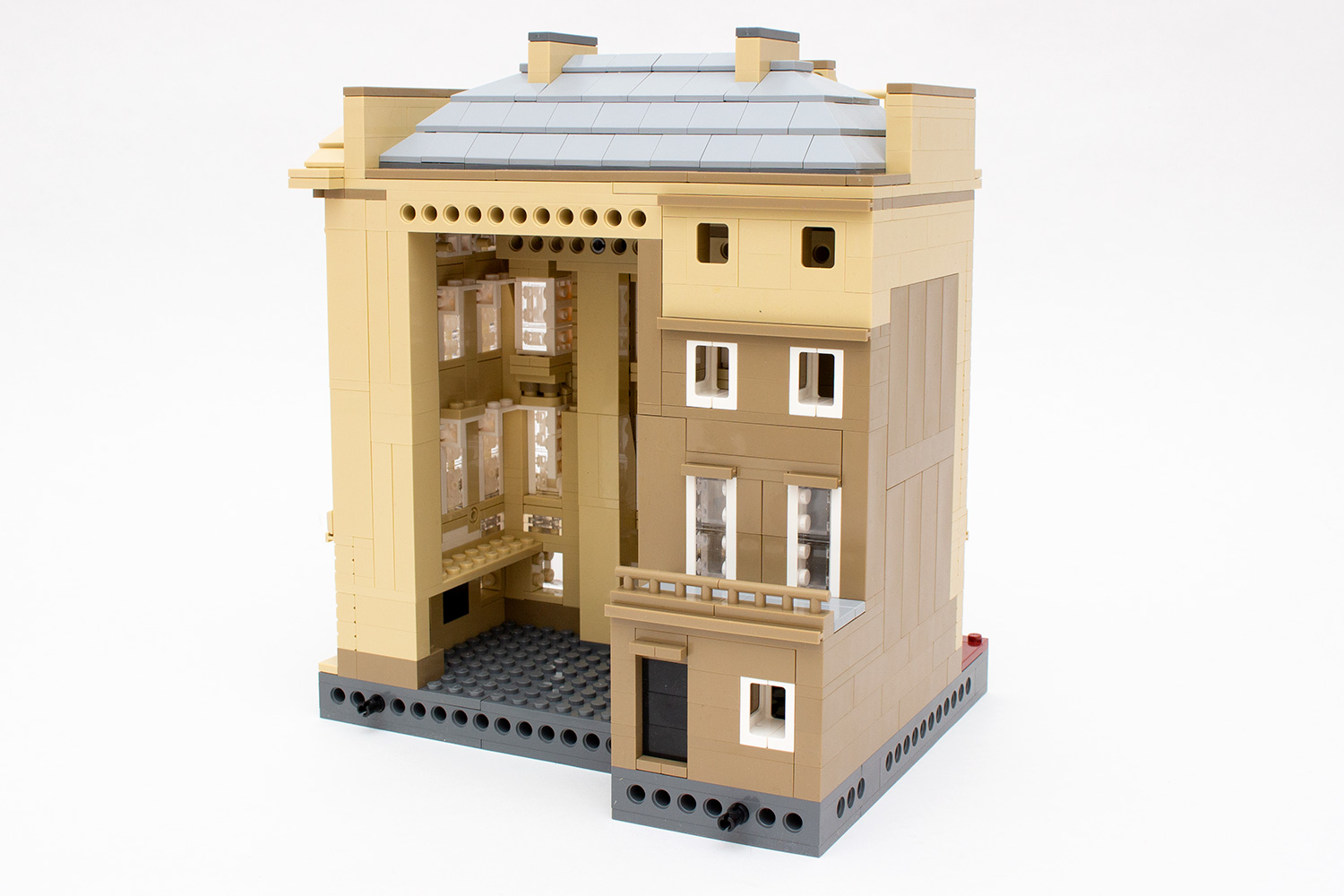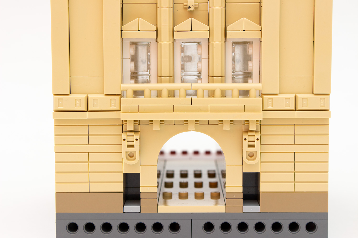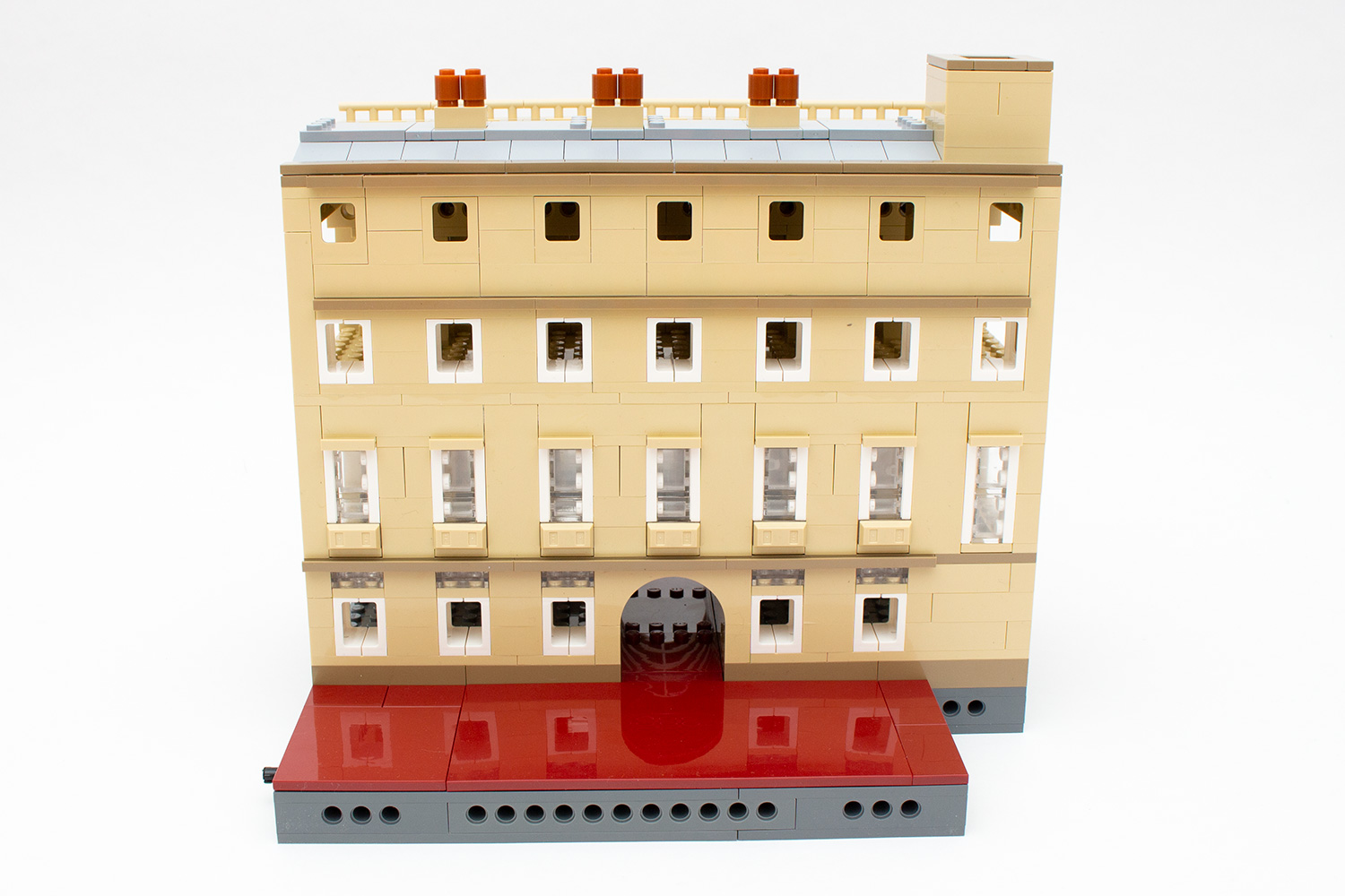 In den weiteren Bauschritten werden die Lücken zwischen den Fenstern gefüllt sowie die seitlichen und teils hinteren Mauern gebaut. Auch wenn der Baumeister aufgrund der Größe zunächst davon ausgehen dürfte, dass er die meiste Zeit die Front des Gebäudes fertigt, stellt diese jedoch viel mehr die seitliche Mauer dar. Im darauffolgenden zweiten und dritten Stock wird ebenso immer wieder an verschiedenen Stellen die Baurichtung umgekehrt – mal seitlich, mal von hinten nach vorne oder wie später bei den Fensterverkleidungen auch einmal um 180 Grad gedreht auf dem Kopf. Vorher wird aber noch die eigentliche, nach vorne ausgerichtete Fassade des Modells gefertigt. Auch hier kommen zahlreiche Techniken der Bauumkehrung zum Einsatz. Bei den Fenstern muss zudem darauf geachtet werden, dass diese sowohl oben wie auch unten eine halbe Noppe nach innen versetzt angebracht werden, sonst kann schnell eine schief anmutende Fassade entstehen.