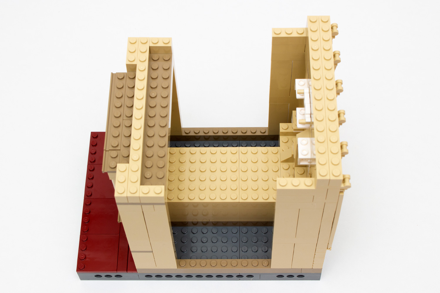 Sind die Mauern komplett hochgezogen, wird der Bau mit einer 16 × 16 Noppen großen Platte in Dark Tan abgedeckt, auf der im Anschluss noch die kleine Mauer samt grauem Dach aufgebracht wird. Vorher noch die Verzierungen in Front, die Uhr auf der Rückseite angebracht sowie die Union Flag gehisst und auch der Bau ist nach rund 3 Stunden fertiggestellt.