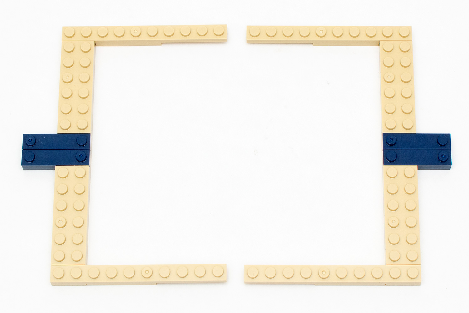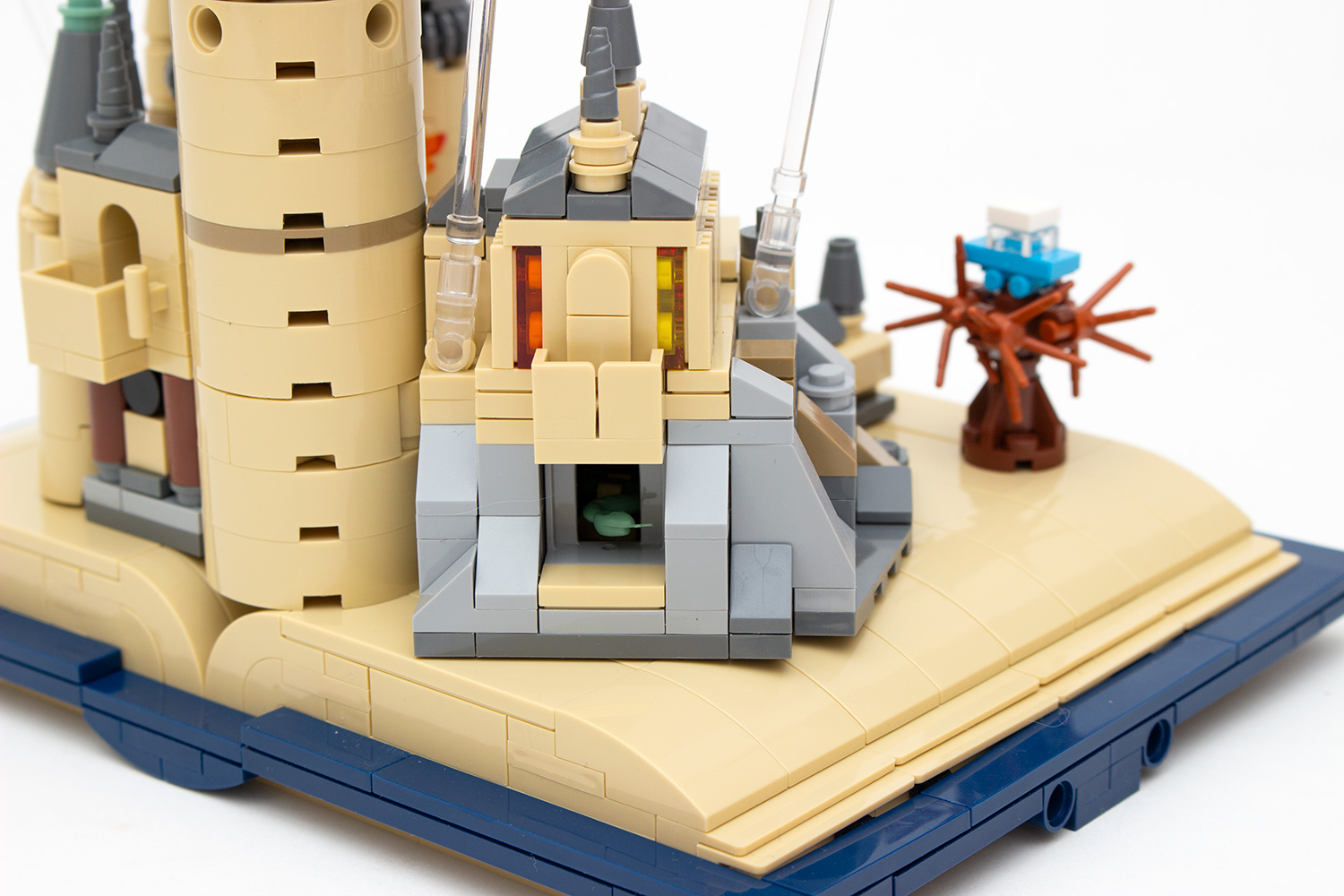 Das bedeutet aber nicht, dass der Aufbau keine interessanten Umsetzungen mit sich führt. So werden die seitlichen unteren „Blätter“ mit 1 × 4 großen sandfarbenen Panels umgesetzt, bei denen die erste Lage einfach liegend eingelegt und diese mit der nächsten Schicht gleicher Steine und unter Zuhilfenahme von verschiedenen Brick Modified mit Noppen an den Seiten letztendlich fixiert wird. Einfach, aber optisch sehr wirkungsvoll.