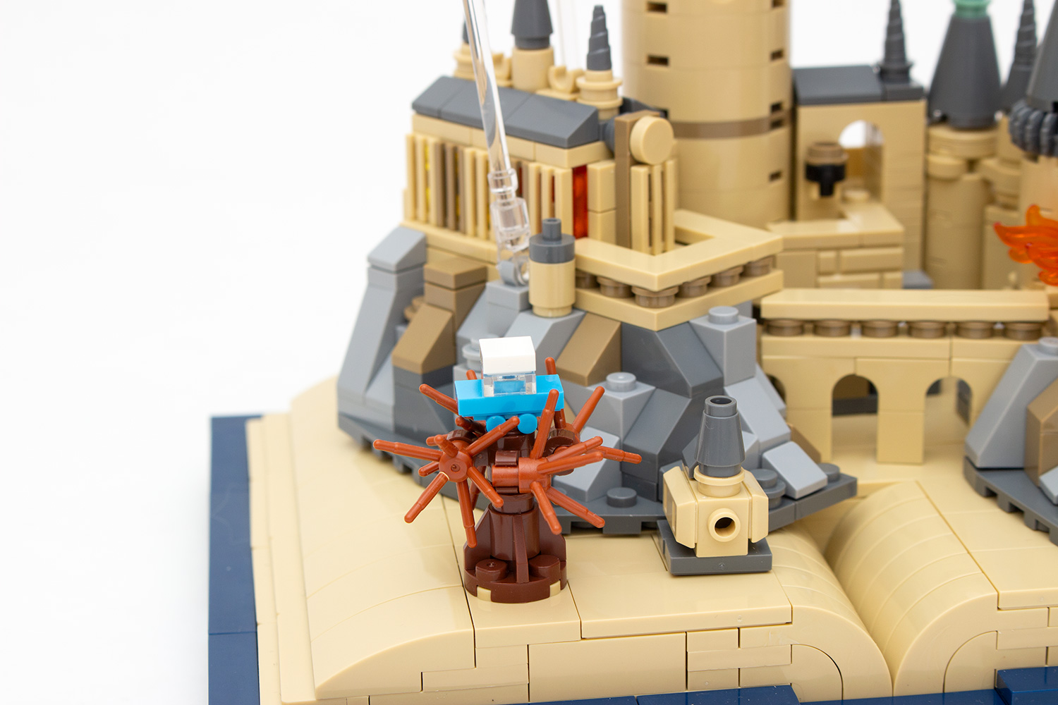 Das Modell selbst wird aus 732 Steinen gebaut, die in 16 Tüten verpackt sind und ist bei chinesischen Händlern für unter 20 Euro erhältlich. Der Aufbau ist in zwei Abschnitte gegliedert, wobei im ersten das Buch und im zweiten das eigentliche Schloss gebaut wird. Was bereits auf den Produktbildern zu erkennen ist, wird beim Auspacken der Tüten deutlicher: Tan ist beim vorliegenden Set die dominierende Farbe, gefolgt von Blau und Grau.