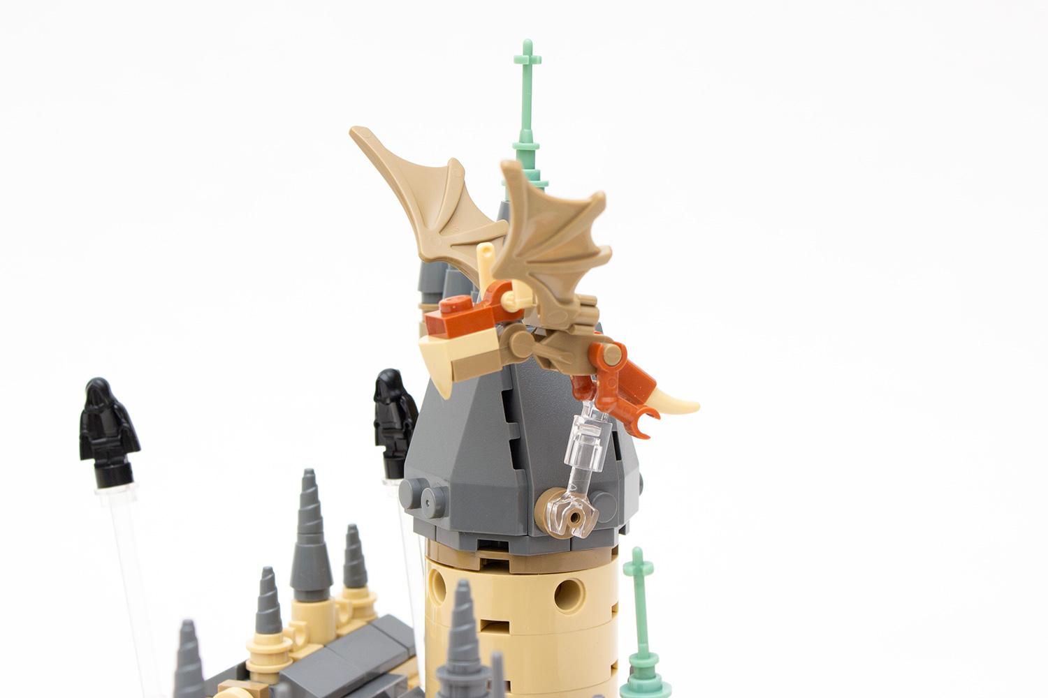 Anschließend werden die beiden kleineren Türme und die Bibliothek gebaut, welche im Original ebenso als Durchgang zur Galerie dient, die aber nicht Teil des vorliegenden Modells ist. Zu guter Letzt noch drei Dementoren (die irgendwie an einen Bösewicht aus einer bekannten Sternen-Saga erinnern) an transparente Stäbe gesetzt, den ungarischen Hornschwanz gebaut und an den Turm befestigt sowie die peitschende Weide samt Auto hinzugefügt und das Modell ist nach rund drei Stunden Bauzeit fertiggestellt.