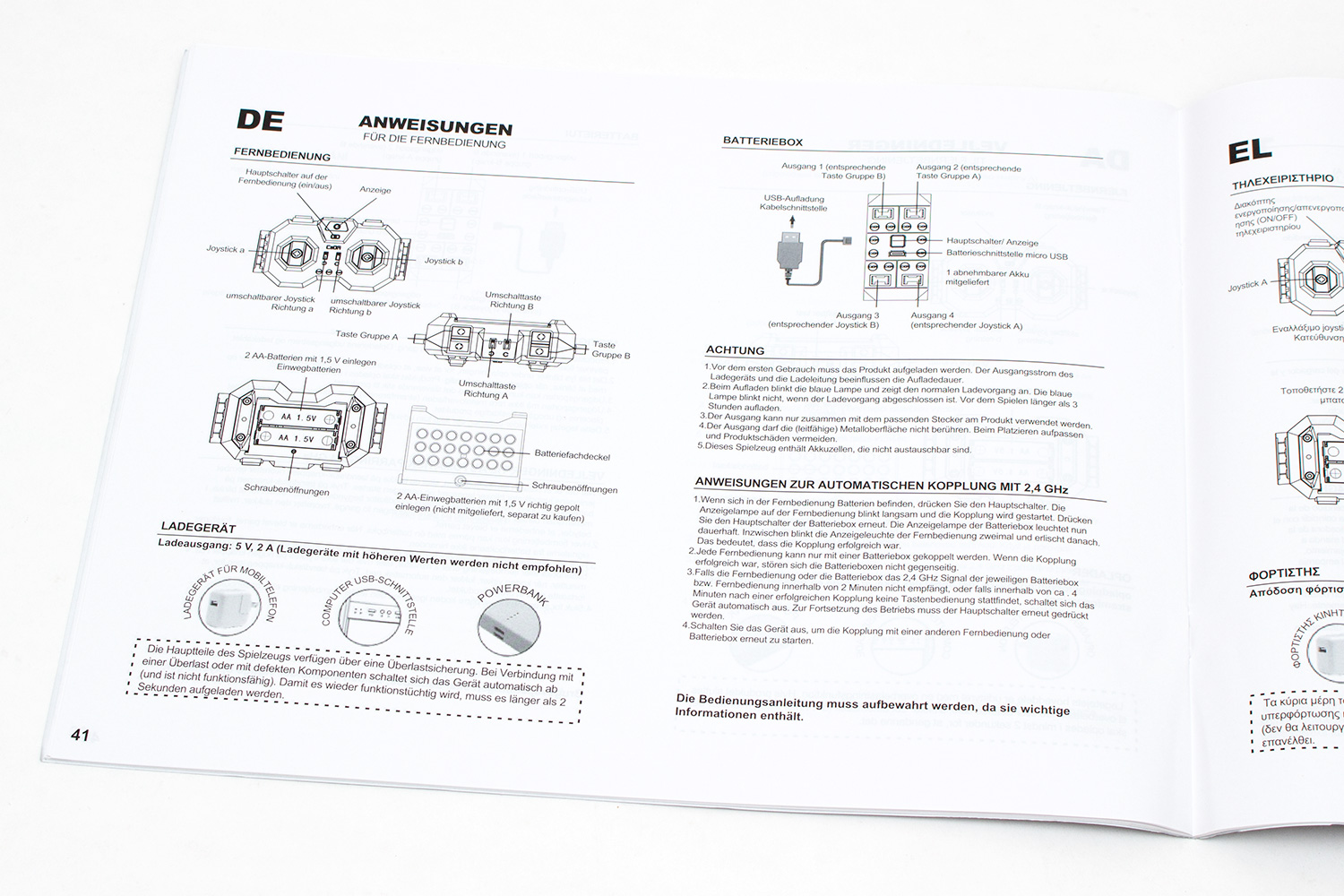 Dafür hat es der Karton auch im wahrsten Sinne des Wortes in sich: 6 kg müssen erst einmal entweder vom stationären Ladengeschäft oder zumindest bei Lieferung von der Haustür zum Bautisch getragen werden. Wer schon einmal ein Technik-Set von CaDA gebaut hat, dem wird das Innere der Verpackung durchaus bekannt vorkommen. Die benötigten Teile werden in insgesamt sechs kleinere Kartons verpackt, wobei sich die Bauanleitung unter dem größeren in der Mitte befindet. Zu dieser gehört auch erstmals eine Gebrauchsanleitung, in der die Funktionen der beiliegenden Fernbedienung erklärt wird.