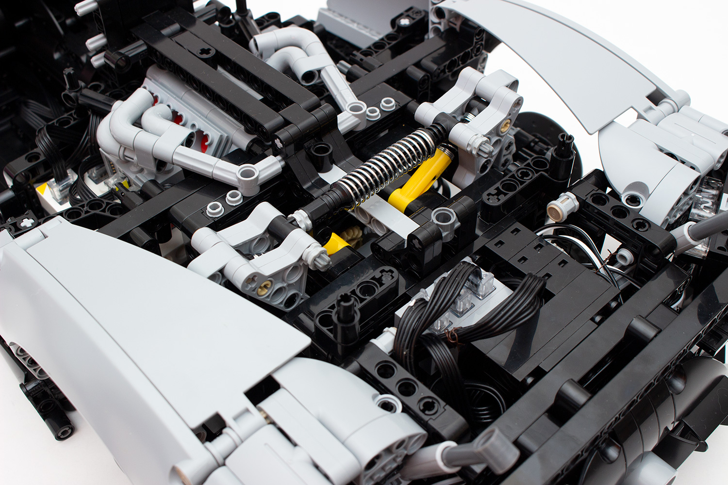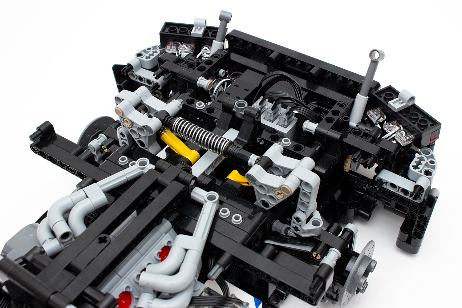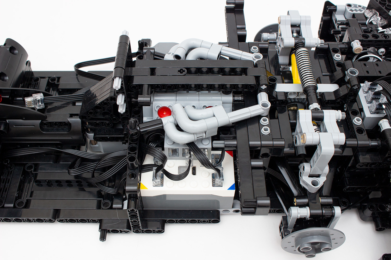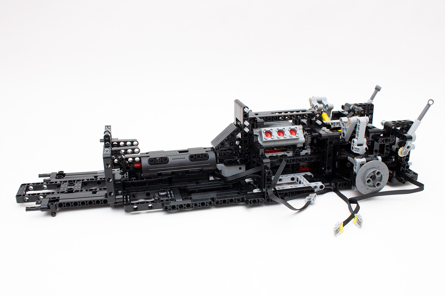 Im weiteren Bauverlauf arbeitet der Baumeister Stück für Stück die Aufhängungen aus. So werden zunächst auf beiden Seiten die Bremsscheiben mit den Pinaufnahmen der Räder sowie der Antriebsstrang angesetzt. In den nächsten Bauschritten kommt die Federung hinzu, bei der die vertikalen Bewegungen der Räder über eine interessante Konstruktion auf engem Raum aufgefangen werden. Hier ist vor allem auf die richtige Position der Pins zu achten. Ist dies geschafft, wird bereits jetzt der V-Motor mit seinen sechs Zylindern gebaut und eingesetzt. Auch hier unterscheidet sich der Aufbau vom Gewohnten, da sonst der jeweilige Motornachbau erst später ansteht.