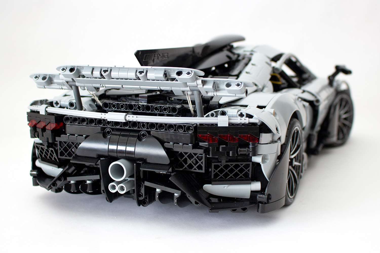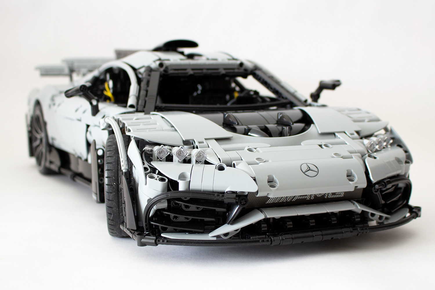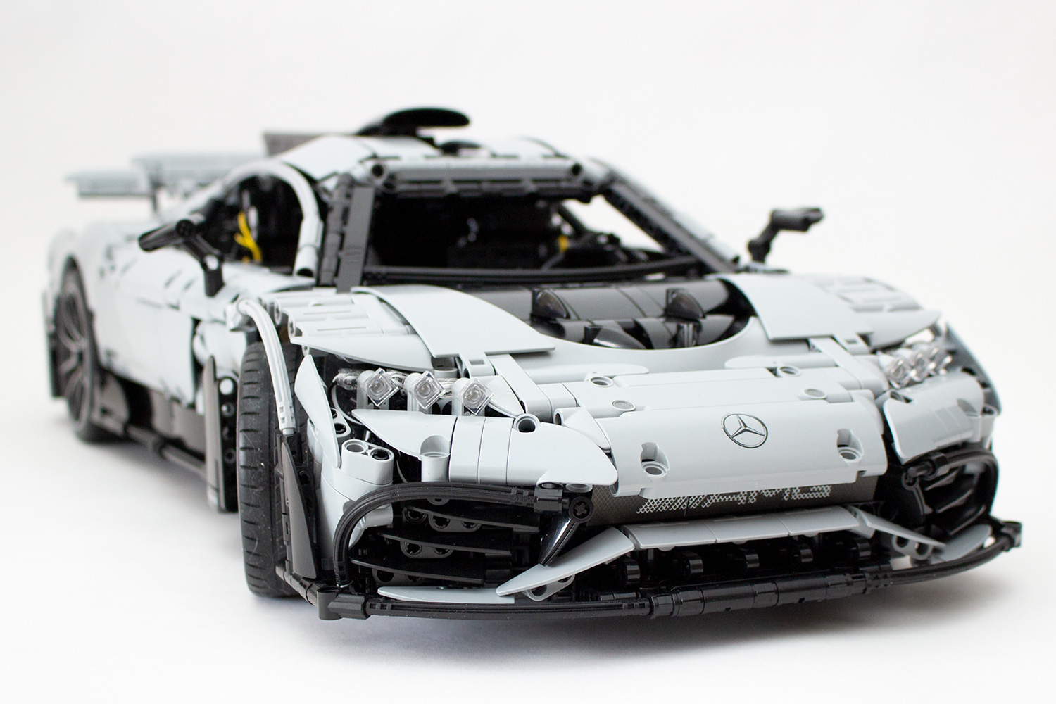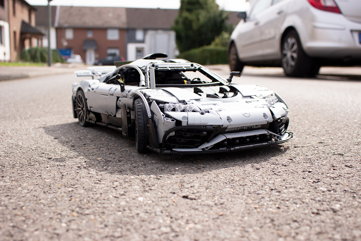 Verläuft der Test positiv, müssen noch aus gelben 1 × 4 großen Curved Slopes die Bremssattel gefertigt und angebracht sowie die Räder aufgezogen werden. Hier darf sich nicht gewundert werden, wenn sich diese zunächst den einen oder anderen Teil der Karosserie berühren – das Eigengewicht des Modells sorgt später für genügend Abstand. Zum Abschluss noch ein paar Schläuche als Verzierung angebracht, das Lenkrad an die Fernsteuerung geklemmt und schon ist die Miniaturausführung des Mercedes AMG One nach rund 16 Stunden Bauzeit bereit für eine erste Testfahrt bereit.