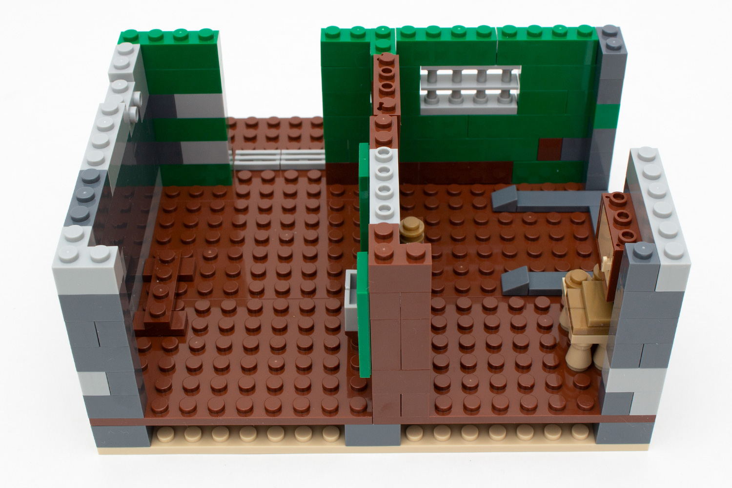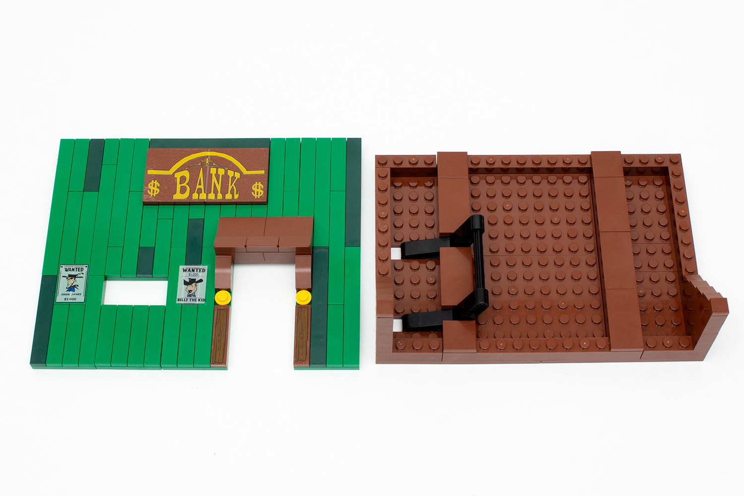 Die um ihre Einnahmen erleichterte Bank wird auf einer Grundplatte mit 20 × 20 Noppen gebaut, was in ungefähr auch die spätere Größe erahnen lässt. Zuerst wird der Boden um eine Steineeinheit erhöht, um das für Häuser des „Wilden Westens“ gewohnte Erscheinungsbild zu schaffen. Direkt danach wird mit dem Bau der Wände begonnen.