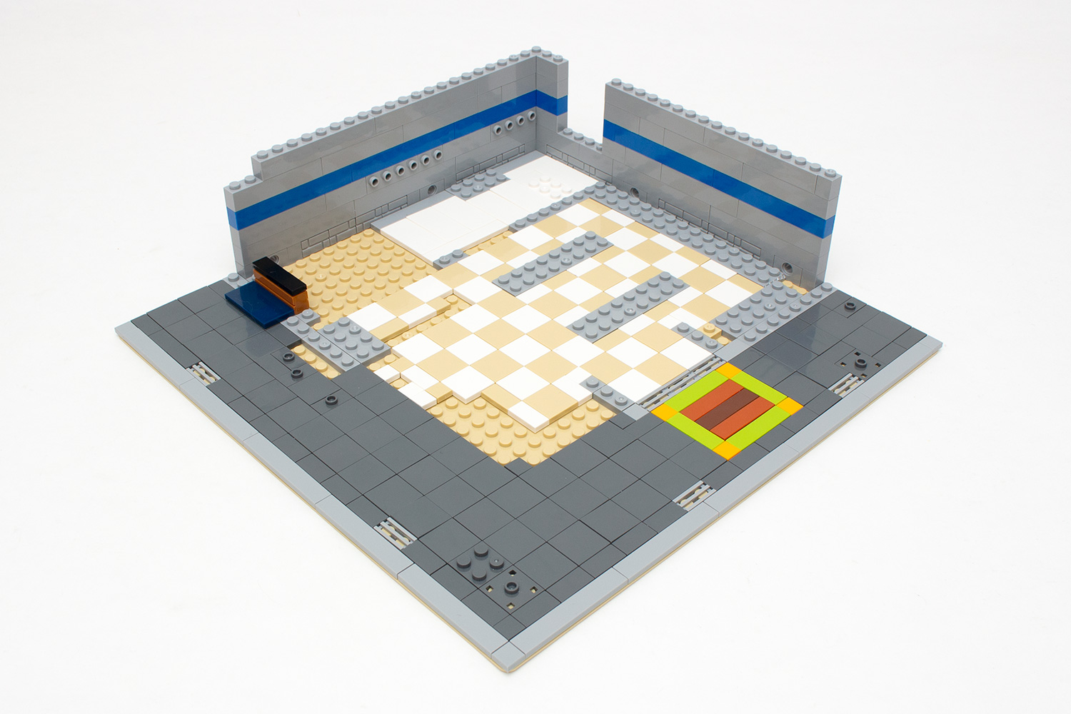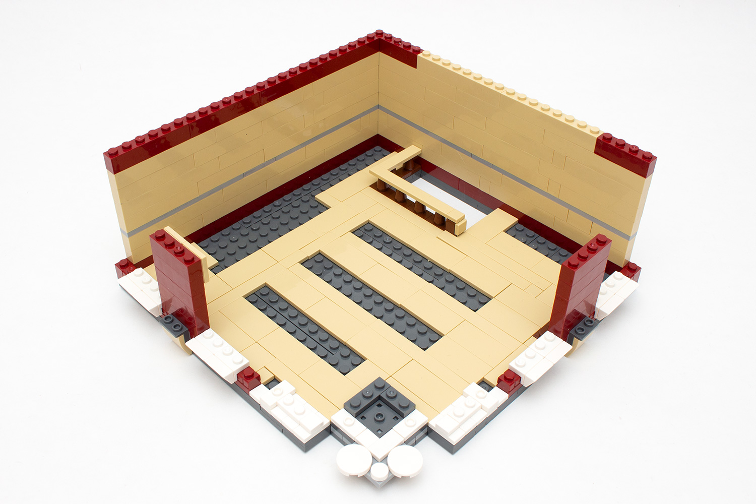 Anschließend werden weitere Plates sowie eine Mischung aus normalen Steinen und Brick Modified mit Noppen an den Seiten als eine Art Ringanker zur Stabilisierung angebracht, bevor weitere kleine Verzierungen sowie die bekannten Fliesen nicht nur den Bau des Abschnittes, sondern auch den der ganzen Etage abschließen.