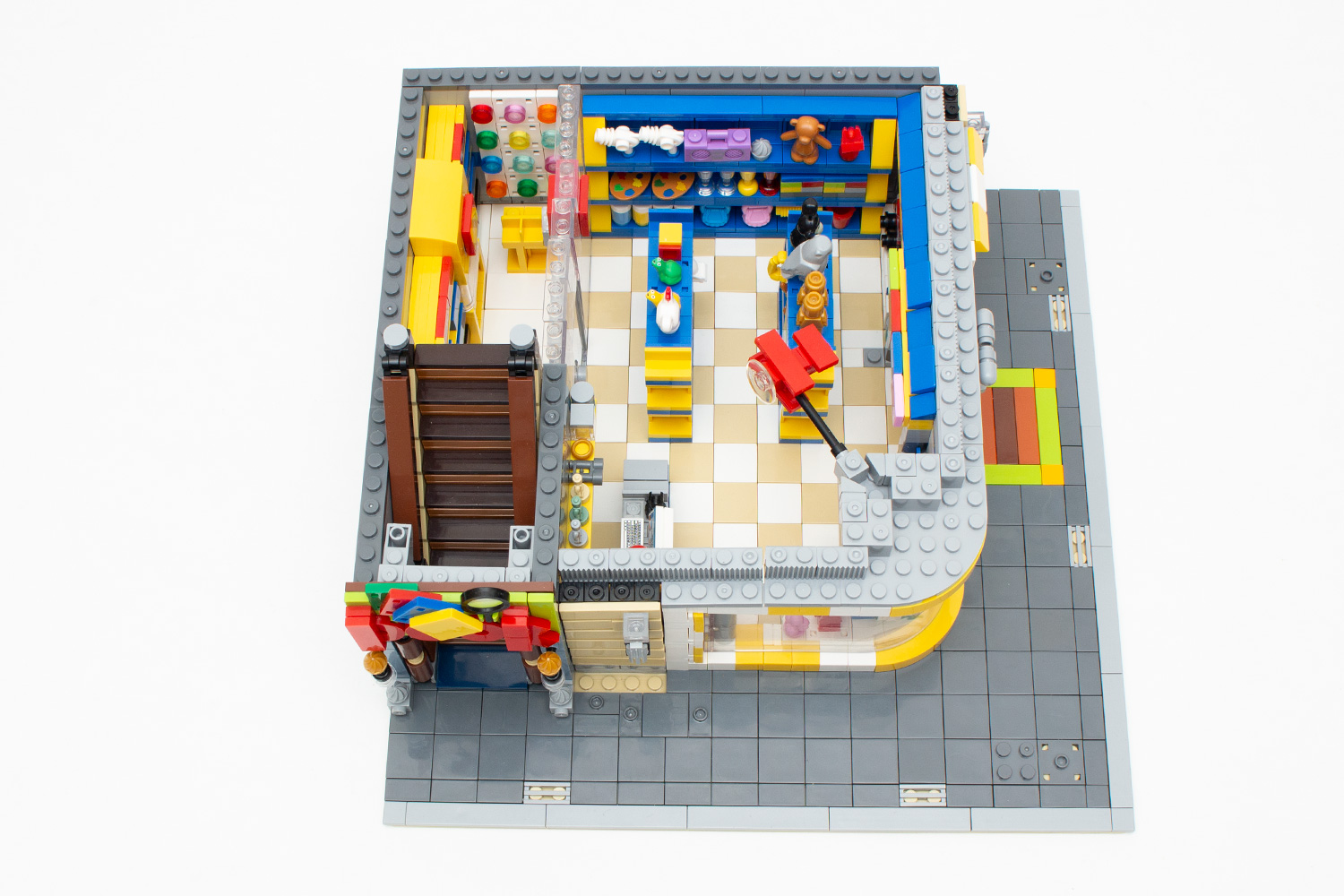 Dass viele Bauabschnitte nicht zwangsweise lange Bauzeiten bedeuten, wird am Modell des Spielwaren- und Büchergeschäftes schnell deutlich. Alleine die ersten beiden Abschnitte beschäftigen sich mit der üblichen Erstellung des Fundamentes durch eine Vielzahl diverser Fliesen und Plates, die die Größe und Aufteilung des Erdgeschosses verdeutlichen. Mit diesem dürften auch geübte Baumeister rund 45 Minuten beschäftigt sein. Ist dies vollbracht, geht es mit der Errichtung der beiden hinteren Mauern weiter, bei denen die Designer ruhig ein wenig mehr auf versetztes und überlappendes Bauen hätten achten können.