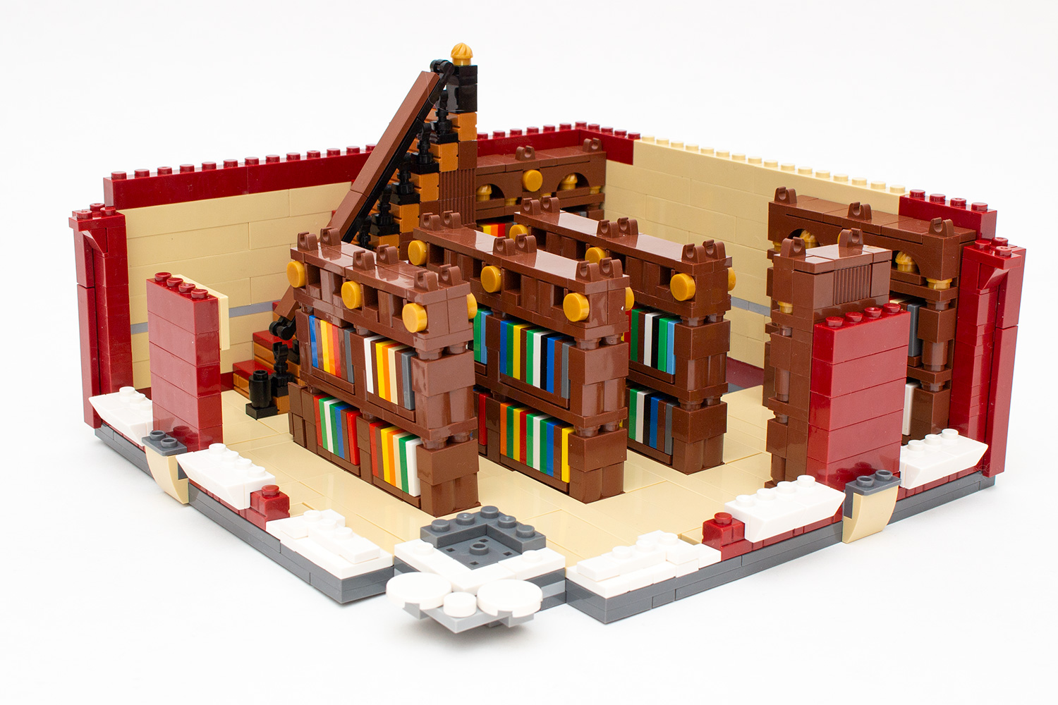 Ist die Grundfläche jedoch einmal erstellt, kann entspannt weitergebaut werden. In den nächsten Bauschritten werden auch hier zahlreiche Fliesen aufgeklemmt, die später die Verkaufsfläche des Büchergeschäftes darstellen sollen. Anschließend folgen die Treppe ins nächste Geschoss sowie zahlreiche Regale, in denen die zum Verkauf angebotenen Bücher lagern. Gleichzeitig werden die Wände weiter hochgezogen und mit Fenstern sowie Bildern versehen.