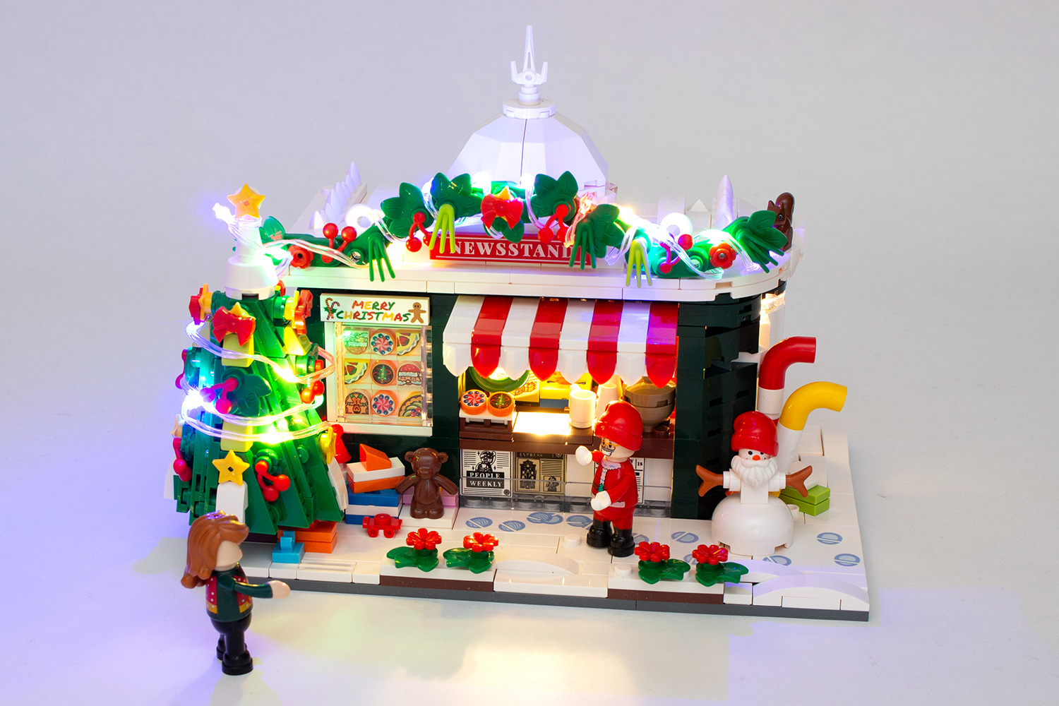 Der Weihnachtskiosk von FunWhole macht es Baumeistern äußerst schwer, Kritikpunkte zu finden – das Modell überzeugt in nahezu allen Belangen und leistet sich dabei keine nennenswerten Schwächen. Dies beginnt bei der sehr guten Steinequalität, setzt sich über den weitestgehend einfachen Aufbau, der nicht zuletzt auf die ebenfalls sehr gut umgesetzte Bauanleitung mit ihren zahlreichen Hilfestellungen zurückzuführen ist, fort und endet mit der stimmungsvollen und durchdachten Beleuchtung. Während viele andere Hersteller an dieser Stelle lediglich LED-Stripes zum Ankleben beilegen, gelingt es FunWhole durch sein ausgeklügeltes Beleuchtungskonzept und den Einsatz vieler speziell dafür entwickelter Steine die Kabel an zahlreichen Stellen geschickt zu verbergen und dadurch eine ganz eigene, stimmige Atmosphäre zu geschaffen.
