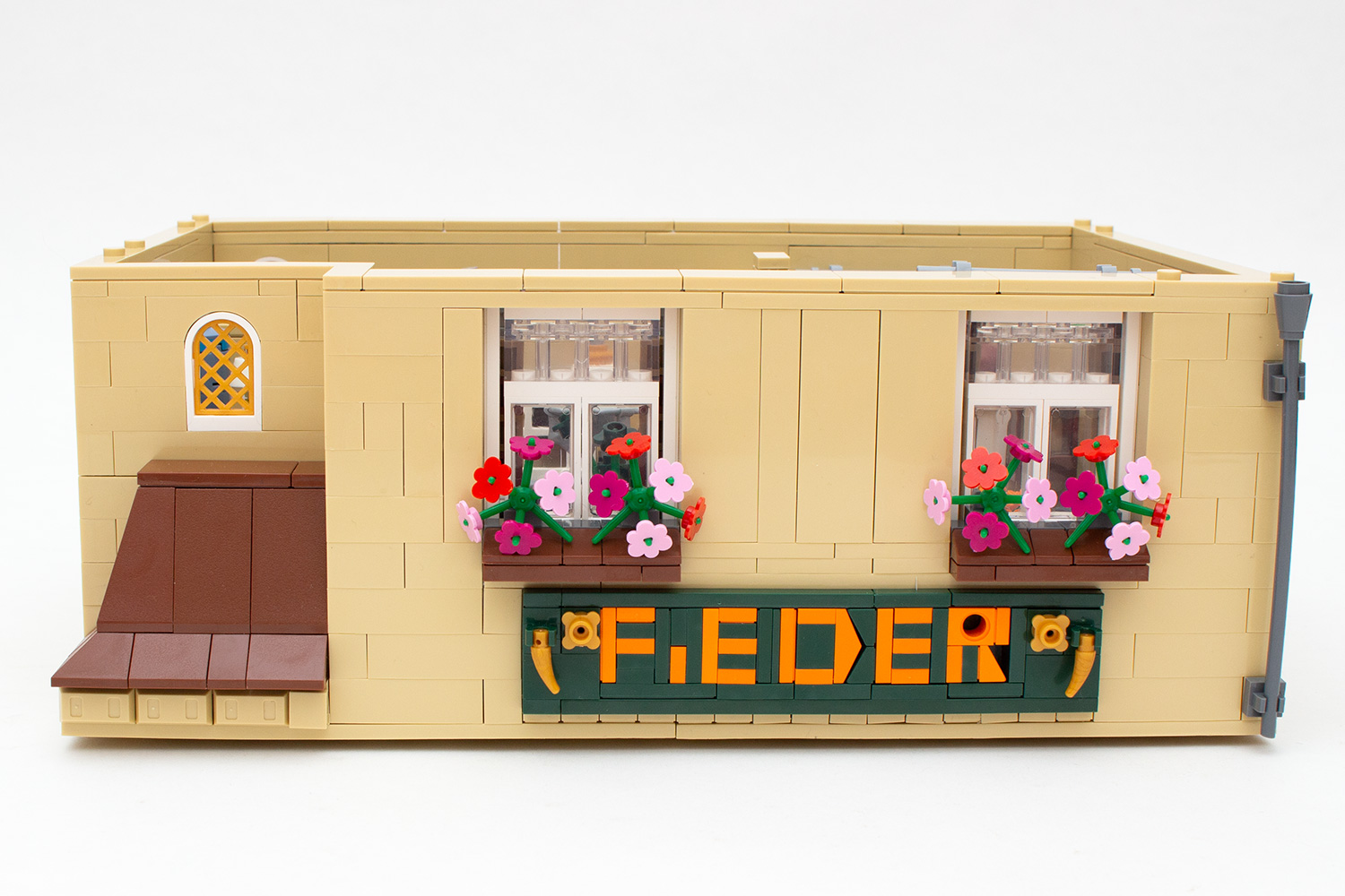 Eine besonders schöne Umsetzung stellt das große Namensschild über dem großen Fenster dar, auf dem nach 37 Bauschritten der bekannte Schriftzug „F. Eder“ prangern wird. Das um eine halbe Steinbreite herausragende Segment ist nicht nur sehr schön gestaltet, sondern zeigt auch eine clevere Lösung zur Füllung kleiner Lücken zwischen den vertikalen Fliesen, in dem einfach ein Fahnenelement von hinten in den Spalt geschoben wird. Auf der Innenseite des Segmentes ist wiederum ein Heizkörper angebracht, der anschließend das Wohnzimmer wärmen wird.